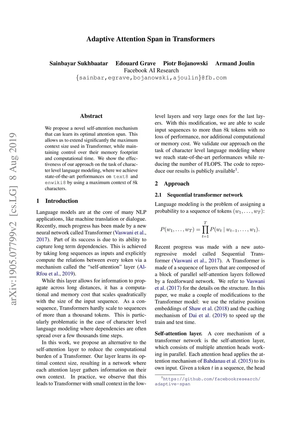 We propose a novel self-attention mechanism that can learn its optimal attention span. This allows us to extend significantly the maximum context size used in Transformer, while maintaining control over their memory footprint and computational time. We show the effectiveness of our approach on the task of character level language modeling, where we achieve state-of-the-art performances on text8 and enwiki8 by using a maximum context of 8k characters.