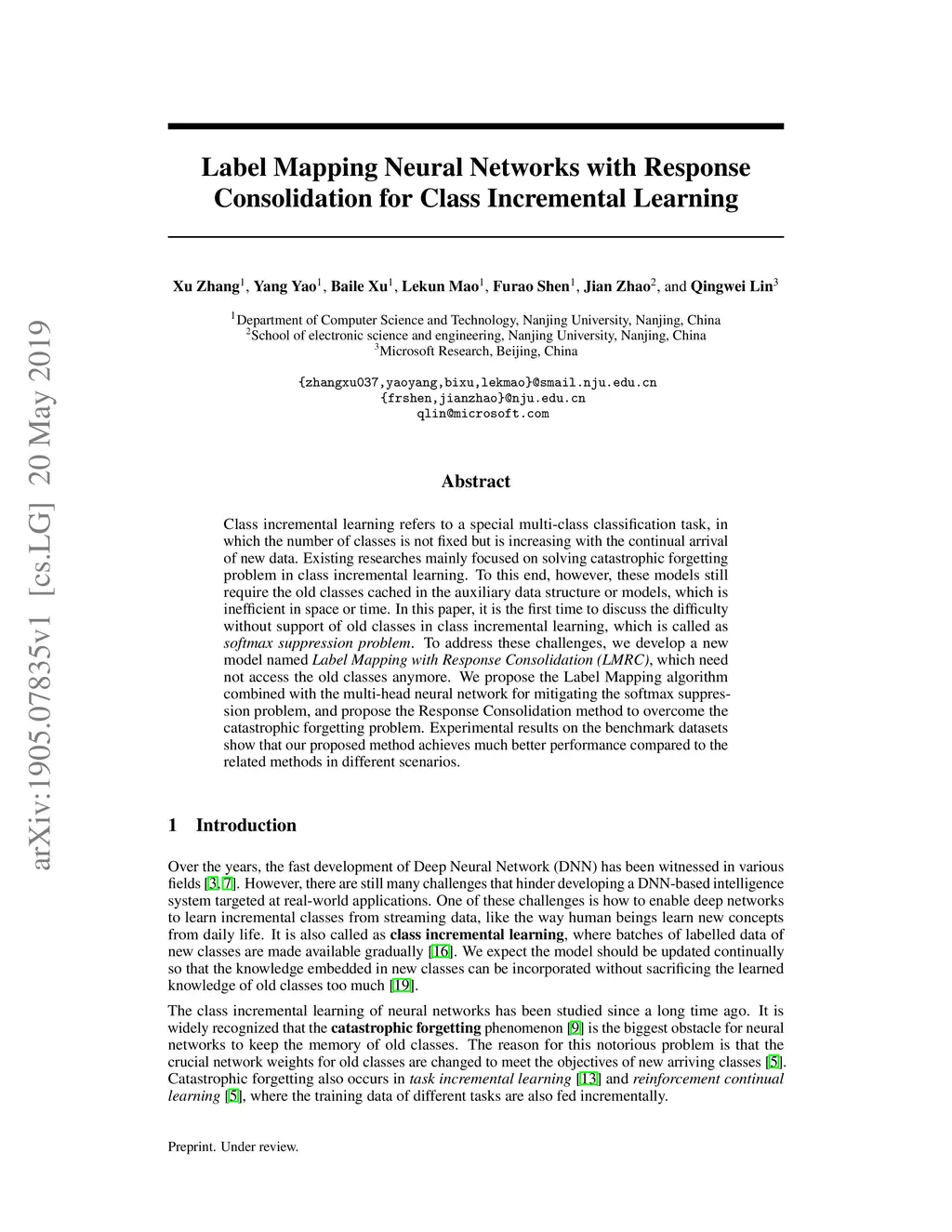 Class incremental learning refers to a special multi-class classification task, in which the number of classes is not fixed but is increasing with the continual arrival of new data. Existing researches mainly focused on solving catastrophic forgetting problem in class incremental learning. To this end, however, these models still require the old classes cached in the auxiliary data structure or models, which is inefficient in space or time. In this paper, it is the first time to discuss the difficulty without support of old classes in class incremental learning, which is called as softmax suppression problem. To address these challenges, we develop a new model named Label Mapping with Response Consolidation (LMRC), which need not access the old classes anymore. We propose the Label Mapping algorithm combined with the multi-head neural network for mitigating the softmax suppression problem, and propose the Response Consolidation method to overcome the catastrophic forgetting problem. Experimental results on the benchmark datasets show that our proposed method achieves much better performance compared to the related methods in different scenarios.