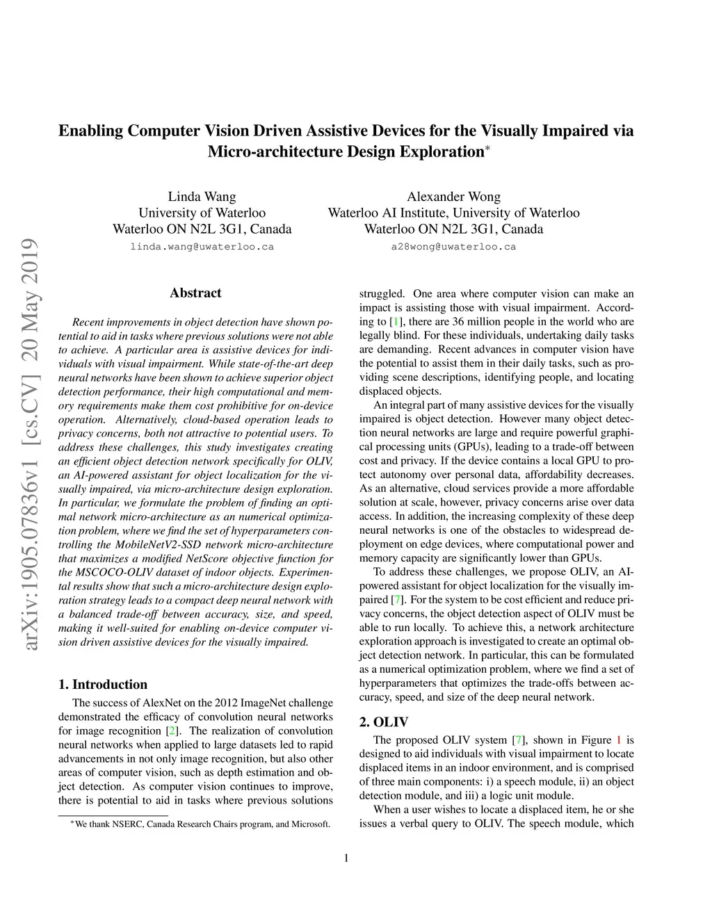 Recent improvements in object detection have shown potential to aid in tasks where previous solutions were not able to achieve. A particular area is assistive devices for individuals with visual impairment. While state-of-the-art deep neural networks have been shown to achieve superior object detection performance, their high computational and memory requirements make them cost prohibitive for on-device operation. Alternatively, cloud-based operation leads to privacy concerns, both not attractive to potential users. To address these challenges, this study investigates creating an efficient object detection network specifically for OLIV, an AI-powered assistant for object localization for the visually impaired, via micro-architecture design exploration. In particular, we formulate the problem of finding an optimal network micro-architecture as an numerical optimization problem, where we find the set of hyperparameters controlling the MobileNetV2-SSD network micro-architecture that maximizes a modified NetScore objective function for the MSCOCO-OLIV dataset of indoor objects. Experimental results show that such a micro-architecture design exploration strategy leads to a compact deep neural network with a balanced trade-off between accuracy, size, and speed, making it well-suited for enabling on-device computer vision driven assistive devices for the visually impaired.