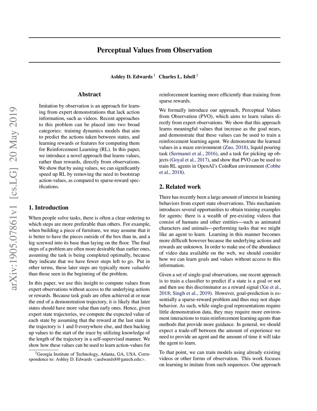 Imitation by observation is an approach for learning from expert demonstrations that lack action information, such as videos. Recent approaches to this problem can be placed into two broad categories: training dynamics models that aim to predict the actions taken between states, and learning rewards or features for computing them for Reinforcement Learning (RL). In this paper, we introduce a novel approach that learns values, rather than rewards, directly from observations. We show that by using values, we can significantly speed up RL by removing the need to bootstrap action-values, as compared to sparse-reward specifications.