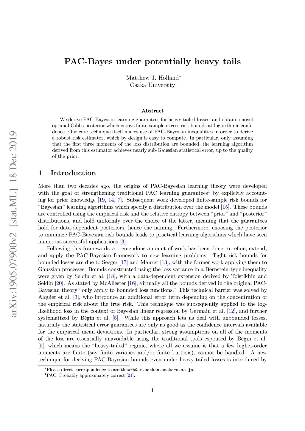 We derive PAC-Bayesian learning guarantees for heavy-tailed losses, and obtain a novel optimal Gibbs posterior which enjoys finite-sample excess risk bounds at logarithmic confidence. Our core technique itself makes use of PAC-Bayesian inequalities in order to derive a robust risk estimator, which by design is easy to compute. In particular, only assuming that the first three moments of the loss distribution are bounded, the learning algorithm derived from this estimator achieves nearly sub-Gaussian statistical error, up to the quality of the prior.