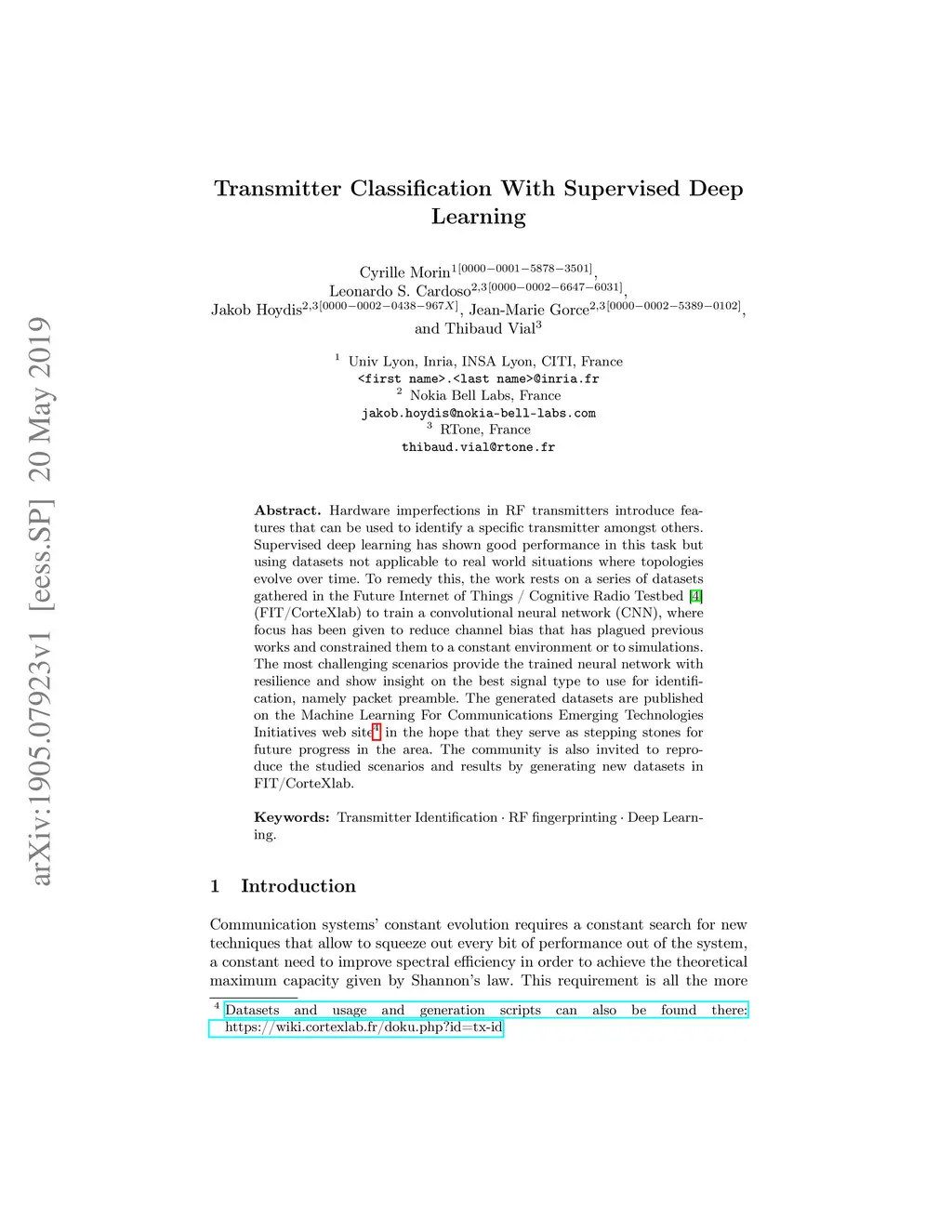 Hardware imperfections in RF transmitters introduce features that can be used to identify a specific transmitter amongst others. Supervised deep learning has shown good performance in this task but using datasets not applicable to real world situations where topologies evolve over time. To remedy this, the work rests on a series of datasets gathered in the Future Internet of Things / Cognitive Radio Testbed [4] (FIT/CorteXlab) to train a convolutional neural network (CNN), where focus has been given to reduce channel bias that has plagued previous works and constrained them to a constant environment or to simulations. The most challenging scenarios provide the trained neural network with resilience and show insight on the best signal type to use for identification , namely packet preamble. The generated datasets are published on the Machine Learning For Communications Emerging Technologies Initiatives web site 4 in the hope that they serve as stepping stones for future progress in the area. The community is also invited to reproduce the studied scenarios and results by generating new datasets in FIT/CorteXlab.