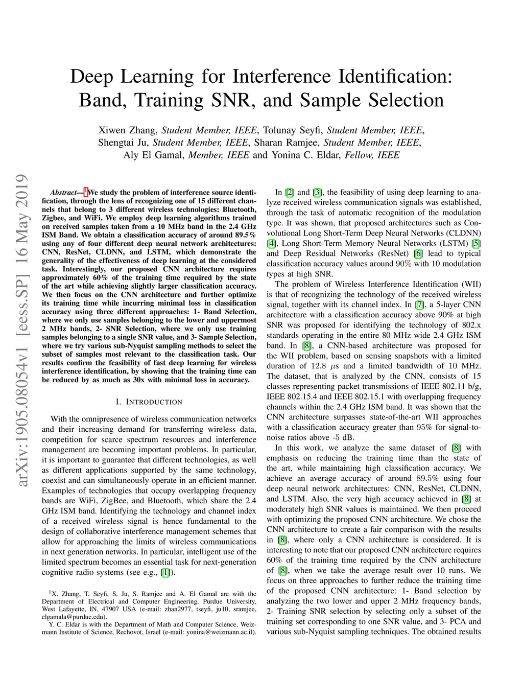 We study the problem of interference source identification, through the lens of recognizing one of 15 different channels that belong to 3 different wireless technologies: Bluetooth, Zigbee, and WiFi. We employ deep learning algorithms trained on received samples taken from a 10 MHz band in the 2.4 GHz ISM Band. We obtain a classification accuracy of around 89.5% using any of four different deep neural network architectures: CNN, ResNet, CLDNN, and LSTM, which demonstrate the generality of the effectiveness of deep learning at the considered task. Interestingly, our proposed CNN architecture requires approximately 60% of the training time required by the state of the art while achieving slightly larger classification accuracy. We then focus on the CNN architecture and further optimize its training time while incurring minimal loss in classification accuracy using three different approaches: 1- Band Selection, where we only use samples belonging to the lower and uppermost 2 MHz bands, 2- SNR Selection, where we only use training samples belonging to a single SNR value, and 3- Sample Selection, where we try various sub-Nyquist sampling methods to select the subset of samples most relevant to the classification task. Our results confirm the feasibility of fast deep learning for wireless interference identification, by showing that the training time can be reduced by as much as 30x with minimal loss in accuracy.