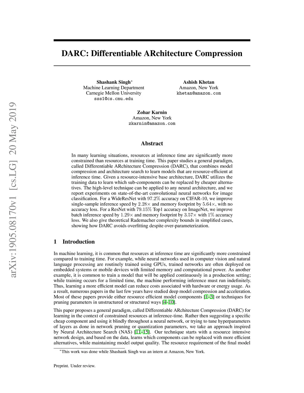 In many learning situations, resources at inference time are significantly more constrained than resources at training time. This paper studies a general paradigm, called Differentiable ARchitecture Compression (DARC), that combines model compression and architecture search to learn models that are resource-efficient at inference time. Given a resource-intensive base architecture, DARC utilizes the training data to learn which sub-components can be replaced by cheaper alternatives. The high-level technique can be applied to any neural architecture, and we report experiments on state-of-the-art convolutional neural networks for image classification. For a WideResNet with accuracy on CIFAR-10, we improve single-sample inference speed by and memory footprint by , with no accuracy loss. For a ResNet with Top1 accuracy on ImageNet, we improve batch inference speed by and memory footprint by with accuracy loss. We also give theoretical Rademacher complexity bounds in simplified cases, showing how DARC avoids overfitting despite over-parameterization.