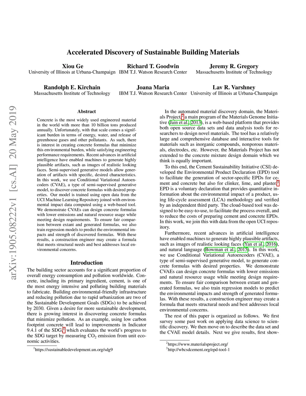 Concrete is the most widely used engineered material in the world with more than 10 billion tons produced annually. Unfortunately, with that scale comes a significant burden in terms of energy, water, and release of greenhouse gases and other pollutants. As such, there is interest in creating concrete formulas that minimize this environmental burden, while satisfying engineering performance requirements. Recent advances in artificial intelligence have enabled machines to generate highly plausible artifacts, such as images of realistic looking faces. Semi-supervised generative models allow generation of artifacts with specific, desired characteristics. In this work, we use Conditional Variational Autoencoders (CVAE), a type of semi-supervised generative model, to discover concrete formulas with desired properties. Our model is trained using open data from the UCI Machine Learning Repository joined with environmental impact data computed using a web-based tool. We demonstrate CVAEs can design concrete formulas with lower emissions and natural resource usage while meeting design requirements. To ensure fair comparison between extant and generated formulas, we also train regression models to predict the environmental impacts and strength of discovered formulas. With these results, a construction engineer may create a formula that meets structural needs and best addresses local environmental concerns.
