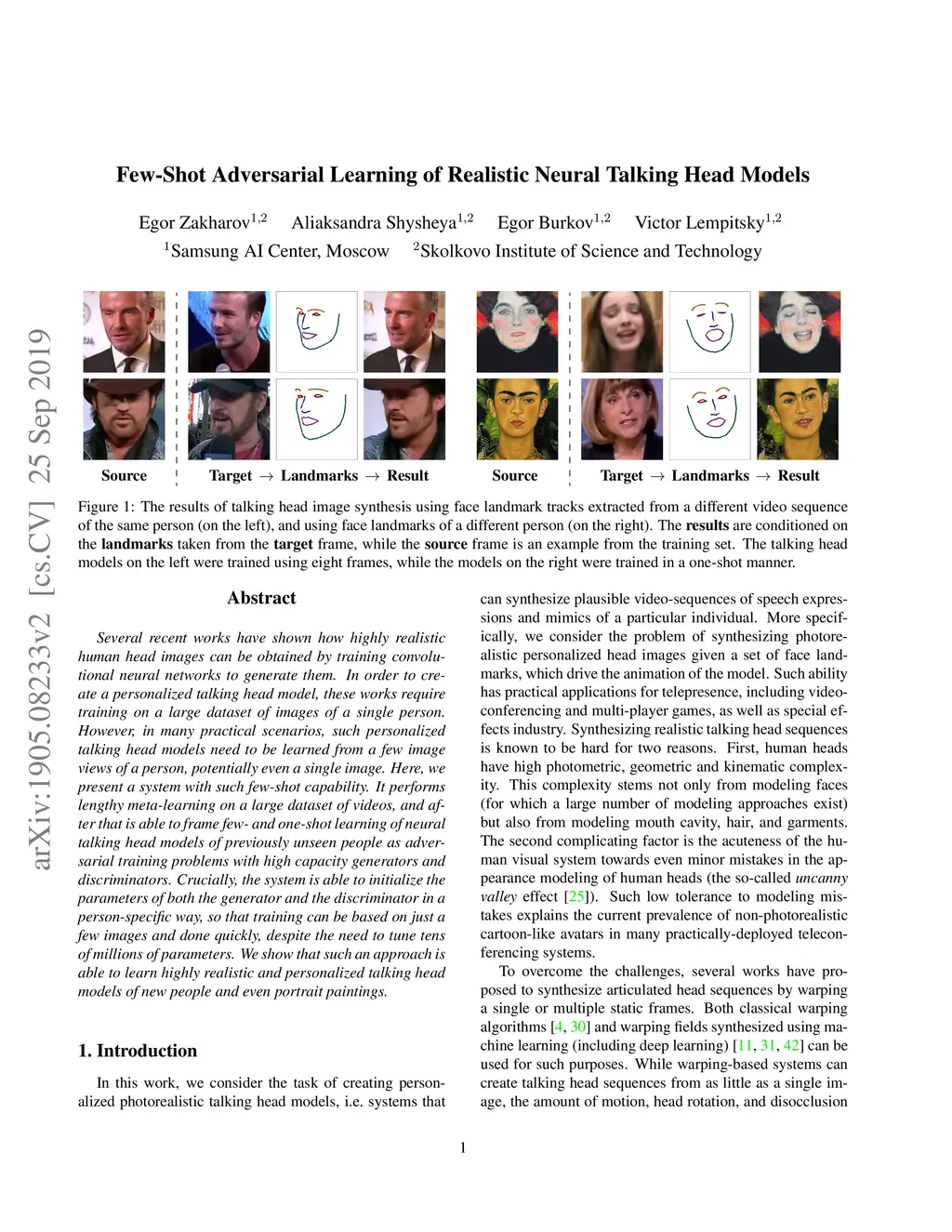 Few-Shot Adversarial Learning of Realistic Neural Talking Head Models