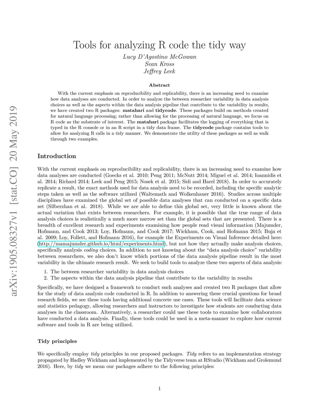 With the current emphasis on reproducibility and replicability, there is an increasing need to examine how data analyses are conducted. In order to analyze the between researcher variability in data analysis choices as well as the aspects within the data analysis pipeline that contribute to the variability in results, we have created two R packages: matahari and tidycode. These packages build on methods created for natural language processing; rather than allowing for the processing of natural language, we focus on R code as the substrate of interest. The matahari package facilitates the logging of everything that is typed in the R console or in an R script in a tidy data frame. The tidycode package contains tools to allow for analyzing R calls in a tidy manner. We demonstrate the utility of these packages as well as walk through two examples.