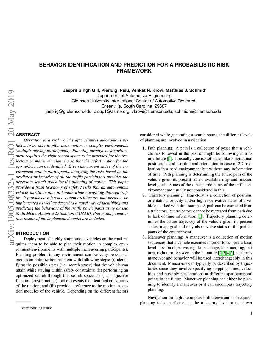 Operation in a real world traffic requires autonomous vehicles to be able to plan their motion in complex environments (multiple moving participants). Planning through such environment requires the right search space to be provided for the trajectory or maneuver planners so that the safest motion for the ego vehicle can be identified. Given the current states of the environment and its participants, analyzing the risks based on the predicted trajectories of all the traffic participants provides the necessary search space for the planning of motion. This paper provides a fresh taxonomy of safety / risks that an autonomous vehicle should be able to handle while navigating through traffic. It provides a reference system architecture that needs to be implemented as well as describes a novel way of identifying and predicting the behaviors of the traffic participants using classic Multi Model Adaptive Estimation (MMAE). Preliminary simulation results of the implemented model are included.