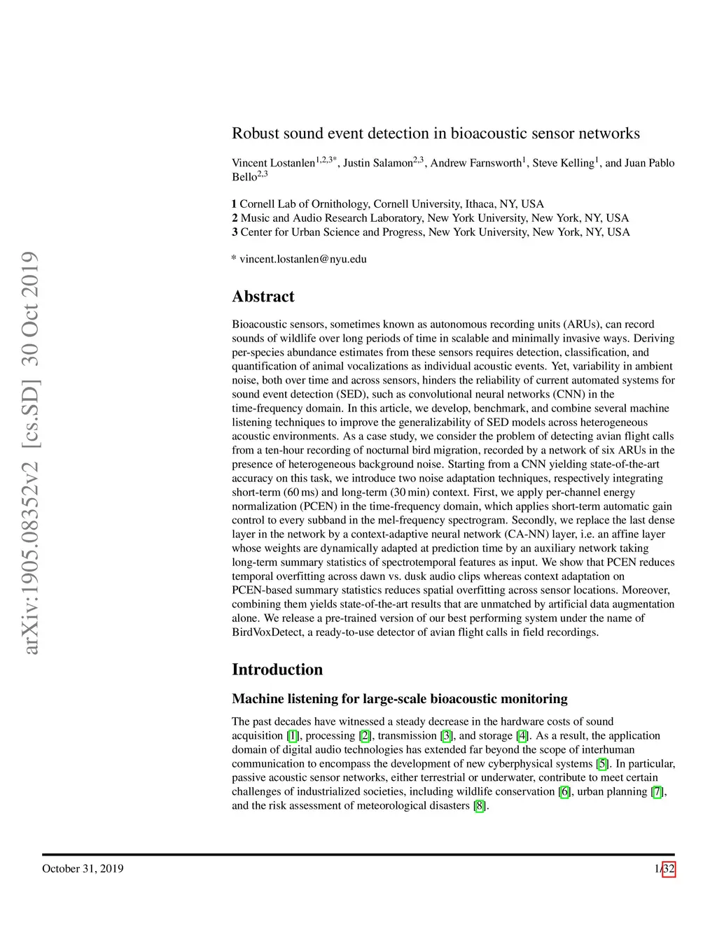 Bioacoustic sensors, sometimes known as autonomous recording units (ARUs), can record sounds of wildlife over long periods of time in scalable and minimally invasive ways. Deriving per-species abundance estimates from these sensors requires detection, classification, and quantification of animal vocalizations as individual acoustic events. Yet, variability in ambient noise, both over time and across sensors, hinders the reliability of current automated systems for sound event detection (SED), such as convolutional neural networks (CNN) in the time-frequency domain. In this article, we develop, benchmark, and combine several machine listening techniques to improve the generalizability of SED models across heterogeneous acoustic environments. As a case study, we consider the problem of detecting avian flight calls from a ten-hour recording of nocturnal bird migration, recorded by a network of six ARUs in the presence of heterogeneous background noise. Starting from a CNN yielding state-of-the-art accuracy on this task, we introduce two noise adaptation techniques, respectively integrating short-term (60 milliseconds) and long-term (30 minutes) context. First, we apply per-channel energy normalization (PCEN) in the time-frequency domain, which applies short-term automatic gain control to every subband in the mel-frequency spectrogram. Secondly, we replace the last dense layer in the network by a context-adaptive neural network (CA-NN) layer. Combining them yields state-of-the-art results that are unmatched by artificial data augmentation alone. We release a pre-trained version of our best performing system under the name of BirdVoxDetect, a ready-to-use detector of avian flight calls in field recordings.