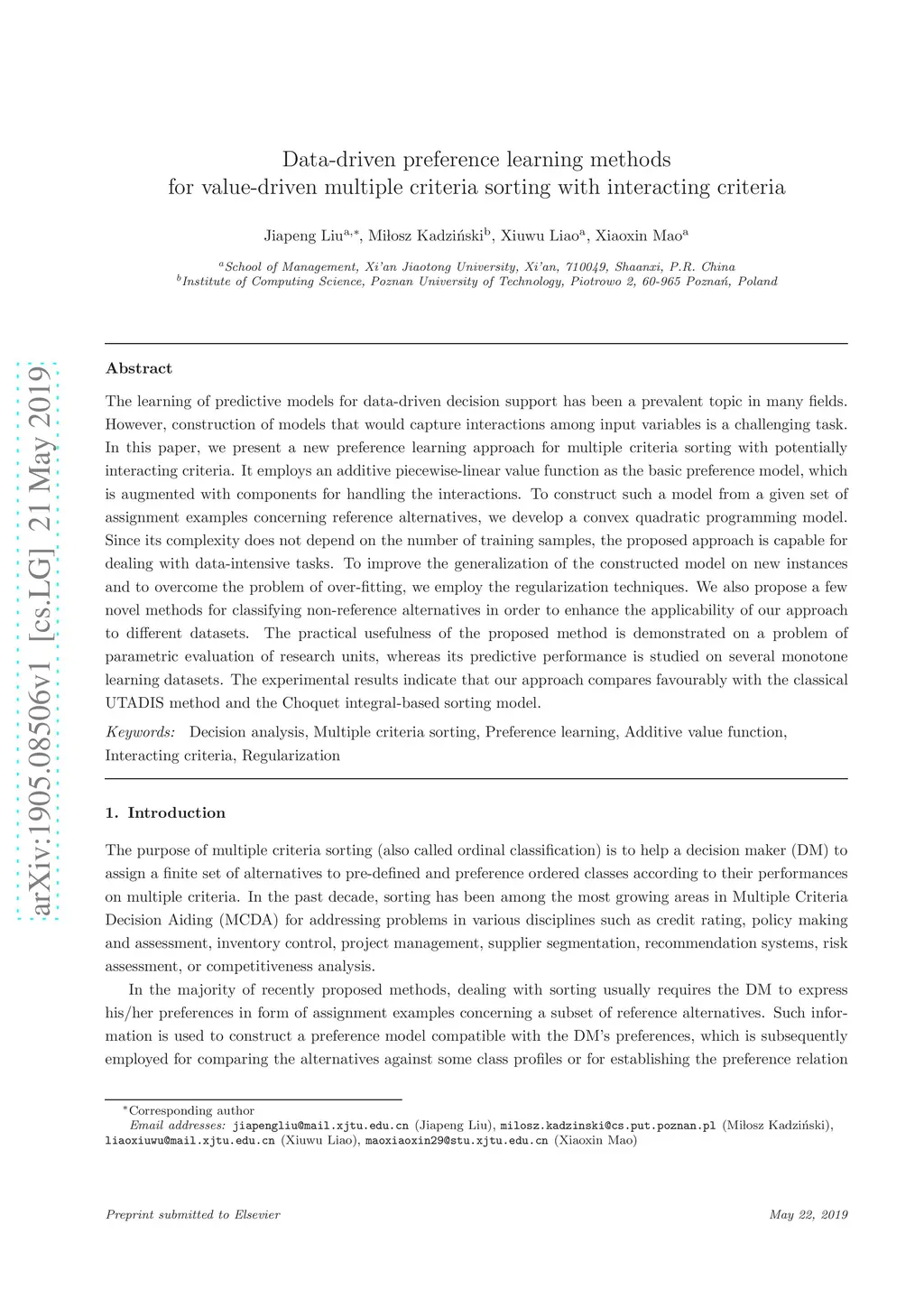 The learning of predictive models for data-driven decision support has been a prevalent topic in many fields. However, construction of models that would capture interactions among input variables is a challenging task. In this paper, we present a new preference learning approach for multiple criteria sorting with potentially interacting criteria. It employs an additive piecewise-linear value function as the basic preference model, which is augmented with components for handling the interactions. To construct such a model from a given set of assignment examples concerning reference alternatives, we develop a convex quadratic programming model. Since its complexity does not depend on the number of training samples, the proposed approach is capable for dealing with data-intensive tasks. To improve the generalization of the constructed model on new instances and to overcome the problem of over-fitting, we employ the regularization techniques. We also propose a few novel methods for classifying non-reference alternatives in order to enhance the applicability of our approach to different datasets. The practical usefulness of the proposed method is demonstrated on a problem of parametric evaluation of research units, whereas its predictive performance is studied on several monotone learning datasets. The experimental results indicate that our approach compares favourably with the classical UTADIS method and the Choquet integral-based sorting model.