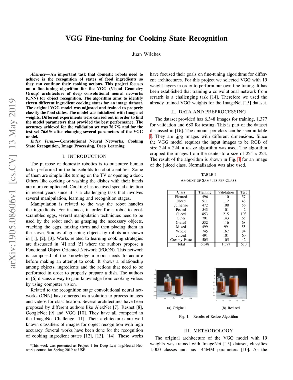 An important task that domestic robots need to achieve is the recognition of states of food ingredients so they can continue their cooking actions. This project focuses on a fine-tuning algorithm for the VGG (Visual Geometry Group) architecture of deep convolutional neural networks (CNN) for object recognition. The algorithm aims to identify eleven different ingredient cooking states for an image dataset. The original VGG model was adjusted and trained to properly classify the food states. The model was initialized with Imagenet weights. Different experiments were carried out in order to find the model parameters that provided the best performance. The accuracy achieved for the validation set was 76.7% and for the test set 76.6% after changing several parameters of the VGG model.