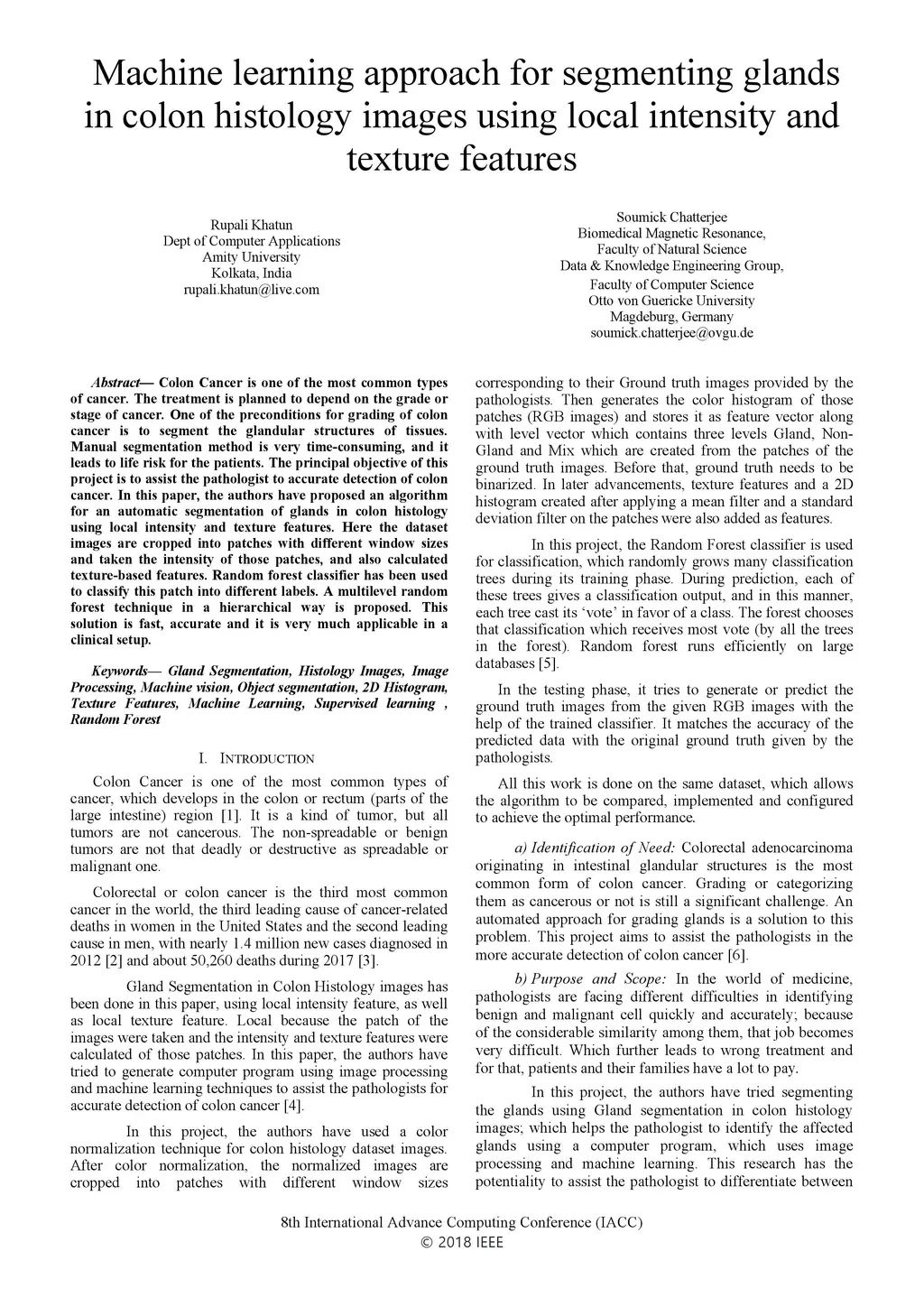 Colon Cancer is one of the most common types of cancer. The treatment is planned to depend on the grade or stage of cancer. One of the preconditions for grading of colon cancer is to segment the glandular structures of tissues. Manual segmentation method is very time-consuming, and it leads to life risk for the patients. The principal objective of this project is to assist the pathologist to accurate detection of colon cancer. In this paper, the authors have proposed an algorithm for an automatic segmentation of glands in colon histology using local intensity and texture features. Here the dataset images are cropped into patches with different window sizes and taken the intensity of those patches, and also calculated texture-based features. Random forest classifier has been used to classify this patch into different labels. A multilevel random forest technique in a hierarchical way is proposed. This solution is fast, accurate and it is very much applicable in a clinical setup.