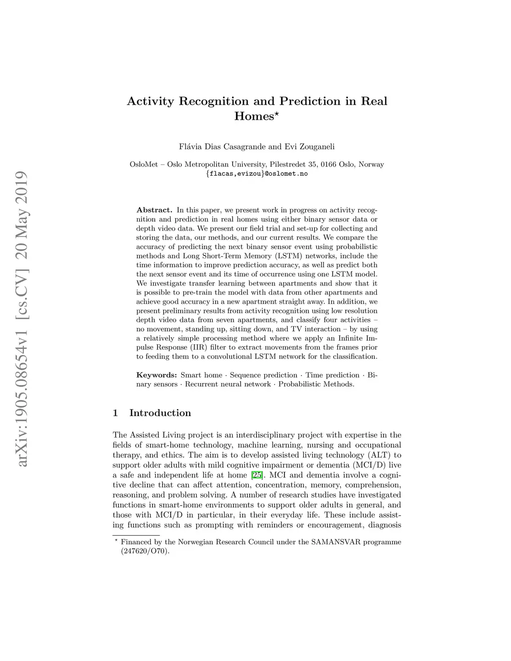In this paper, we present work in progress on activity recognition and prediction in real homes using either binary sensor data or depth video data. We present our field trial and set-up for collecting and storing the data, our methods, and our current results. We compare the accuracy of predicting the next binary sensor event using probabilistic methods and Long Short-Term Memory (LSTM) networks, include the time information to improve prediction accuracy, as well as predict both the next sensor event and its mean time of occurrence using one LSTM model. We investigate transfer learning between apartments and show that it is possible to pre-train the model with data from other apartments and achieve good accuracy in a new apartment straight away. In addition, we present preliminary results from activity recognition using low-resolution depth video data from seven apartments, and classify four activities - no movement, standing up, sitting down, and TV interaction - by using a relatively simple processing method where we apply an Infinite Impulse Response (IIR) filter to extract movements from the frames prior to feeding them to a convolutional LSTM network for the classification.