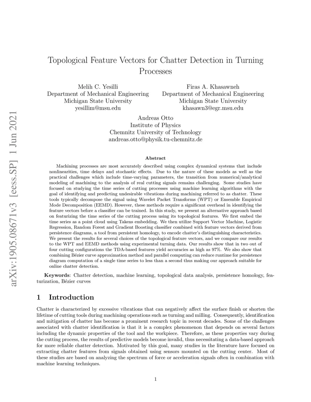 Machining processes are most accurately described using complex dynamical systems that include nonlinearities, time delays, and stochastic effects. Due to the nature of these models as well as the practical challenges which include time-varying parameters, the transition from numerical/analytical modeling of machining to the analysis of real cutting signals remains challenging. Some studies have focused on studying the time series of cutting processes using machine learning algorithms with the goal of identifying and predicting undesirable vibrations during machining referred to as chatter. These tools typically decompose the signal using Wavelet Packet Transforms (WPT) or Ensemble Empirical Mode Decomposition (EEMD). However, these methods require a significant overhead in identifying the feature vectors before a classifier can be trained. In this study, we present an alternative approach based on featurizing the time series of the cutting process using its topological features. We first embed the time series as a point cloud using Takens embedding. We then utilize Support Vector Machine, Logistic Regression, Random Forest and Gradient Boosting classifier combined with feature vectors derived from persistence diagrams, a tool from persistent homology, to encode chatter's distinguishing characteristics. We present the results for several choices of the topological feature vectors, and we compare our results to the WPT and EEMD methods using experimental turning data. Our results show that in two out of four cutting configurations the TDA-based features yield accuracies as high as 97%. We also show that combining Bezier curve approximation method and parallel computing can reduce runtime for persistence diagram computation of a single time series to less than a second thus making our approach suitable for online chatter detection.