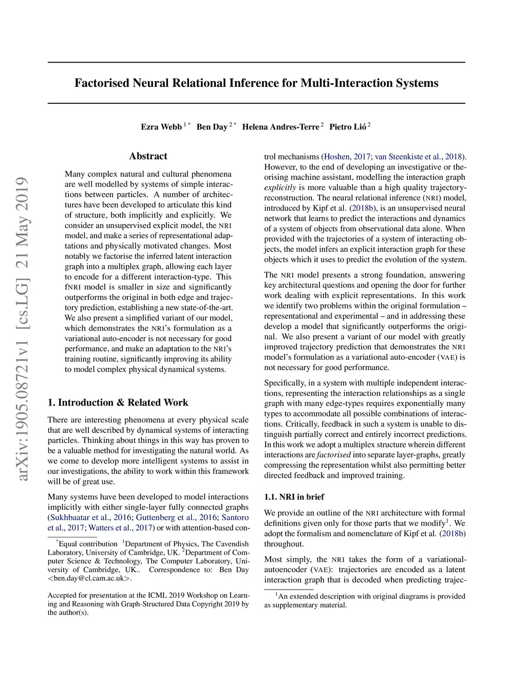 Many complex natural and cultural phenomena are well modelled by systems of simple interactions between particles. A number of architectures have been developed to articulate this kind of structure, both implicitly and explicitly. We consider an unsupervised explicit model, the NRI model, and make a series of representational adaptations and physically motivated changes. Most notably we factorise the inferred latent interaction graph into a multiplex graph, allowing each layer to encode for a different interaction-type. This fNRI model is smaller in size and significantly outperforms the original in both edge and trajectory prediction, establishing a new state-of-the-art. We also present a simplified variant of our model, which demonstrates the NRI's formulation as a variational auto-encoder is not necessary for good performance, and make an adaptation to the NRI's training routine, significantly improving its ability to model complex physical dynamical systems.