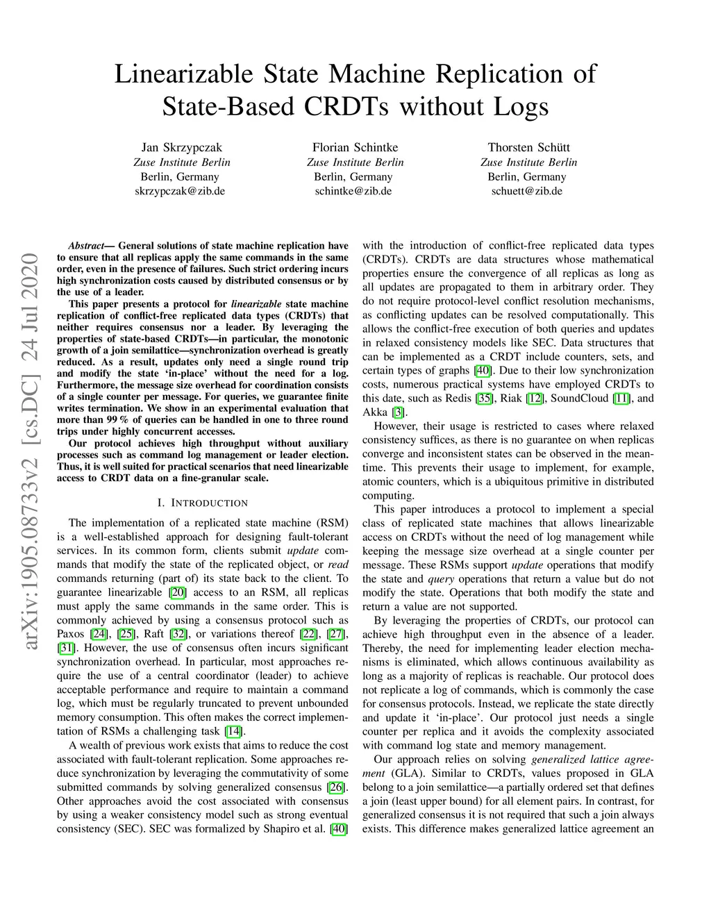Linearizable State Machine Replication of State-Based CRDTs without Logs