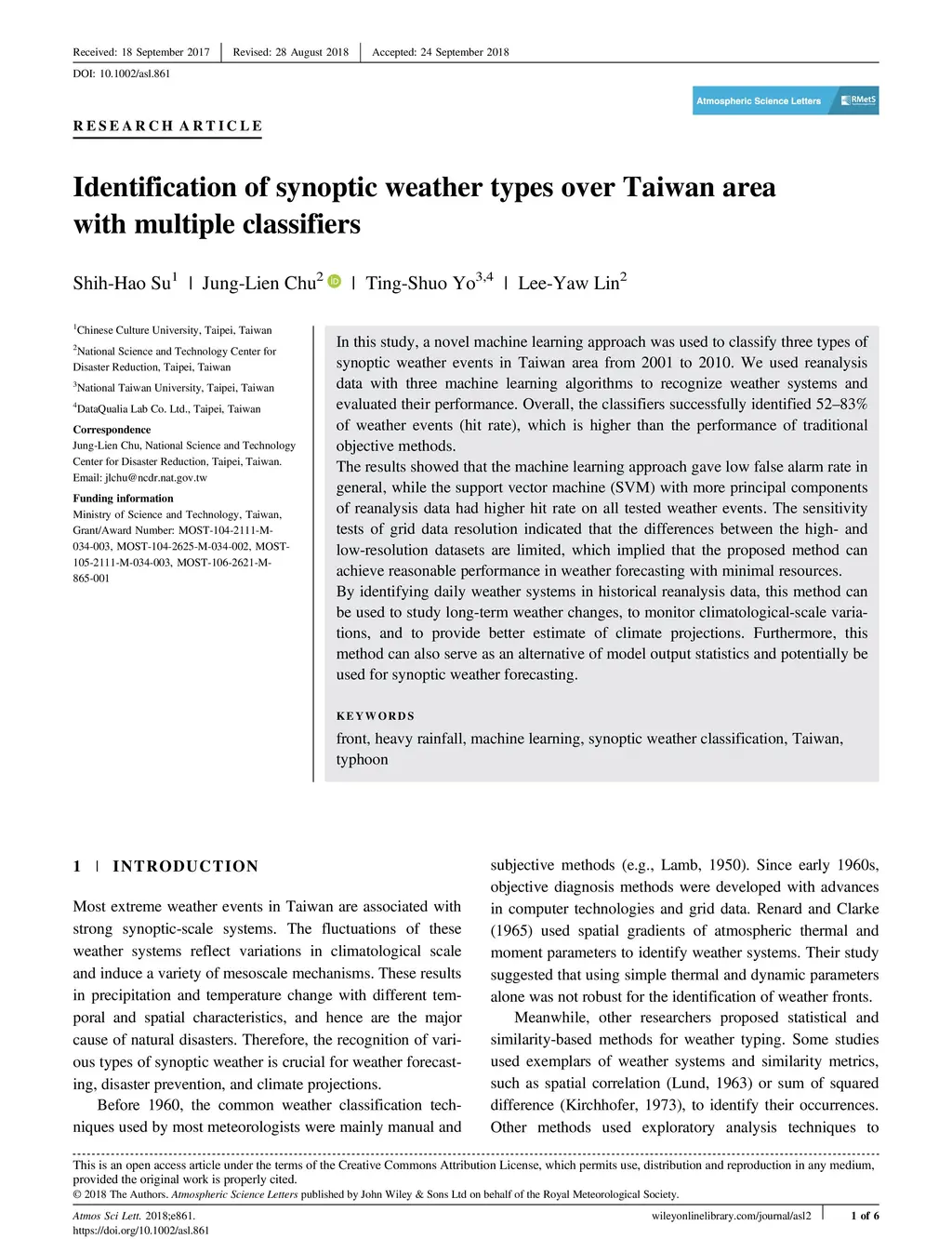 Identification of synoptic weather types over Taiwan area with multiple
