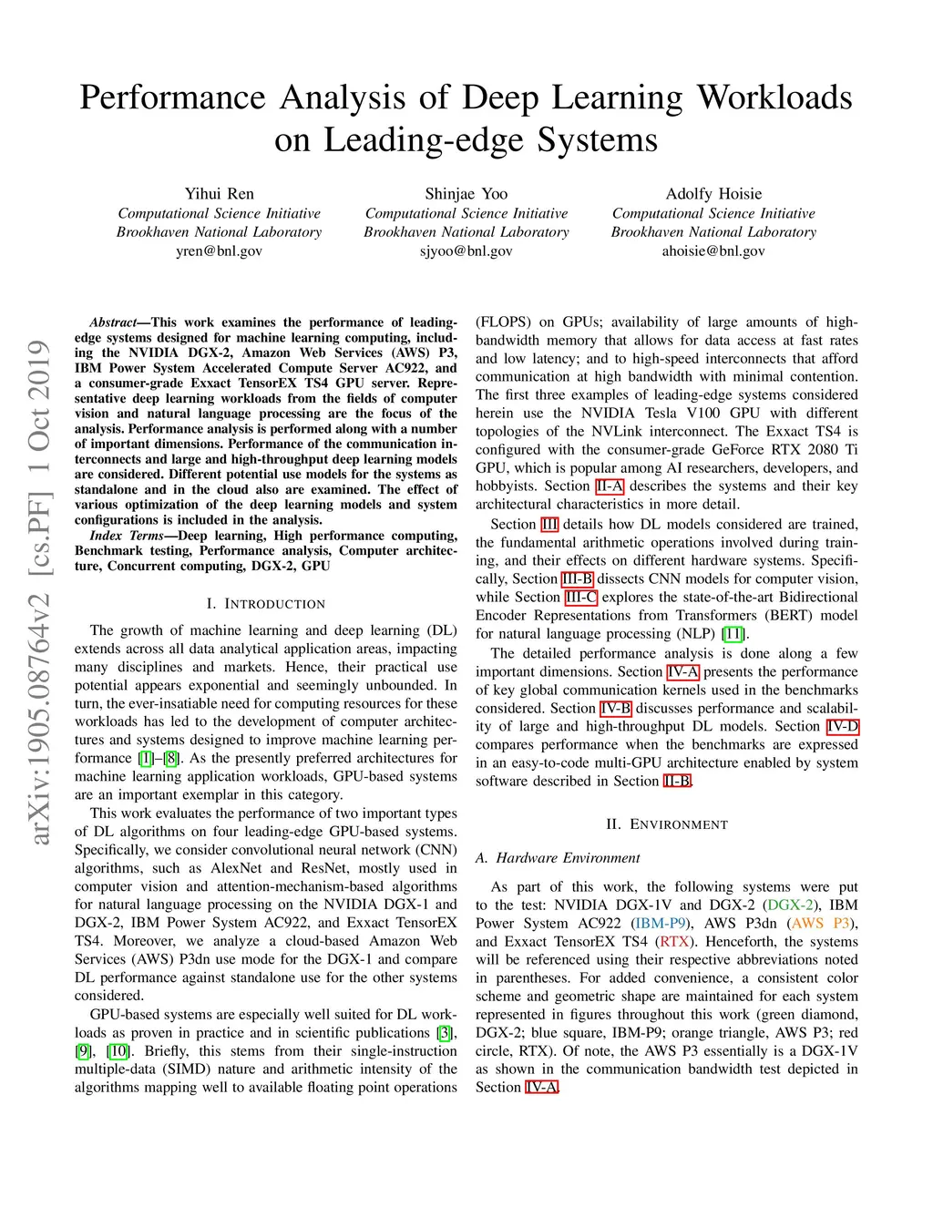 This work examines the performance of leading-edge systems designed for machine learning computing, including the NVIDIA DGX-2, Amazon Web Services (AWS) P3, IBM Power System Accelerated Compute Server AC922, and a consumer-grade Exxact TensorEX TS4 GPU server. Representative deep learning workloads from the fields of computer vision and natural language processing are the focus of the analysis. Performance analysis is performed along with a number of important dimensions. Performance of the communication interconnects and large and high-throughput deep learning models are considered. Different potential use models for the systems as standalone and in the cloud also are examined. The effect of various optimization of the deep learning models and system configurations is included in the analysis.