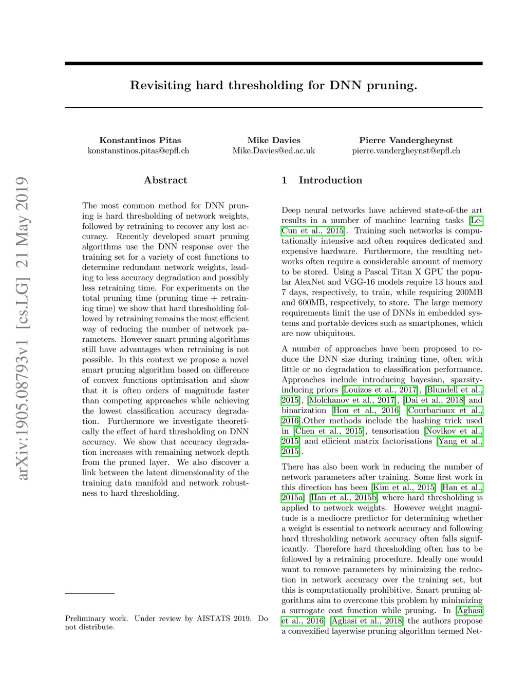 The most common method for DNN pruning is hard thresholding of network weights, followed by retraining to recover any lost accuracy. Recently developed smart pruning algorithms use the DNN response over the training set for a variety of cost functions to determine redundant network weights, leading to less accuracy degradation and possibly less retraining time. For experiments on the total pruning time (pruning time + retraining time) we show that hard thresholding followed by retraining remains the most efficient way of reducing the number of network parameters. However smart pruning algorithms still have advantages when retraining is not possible. In this context we propose a novel smart pruning algorithm based on difference of convex functions optimisation and show that it is often orders of magnitude faster than competing approaches while achieving the lowest classification accuracy degradation. Furthermore we investigate theoretically the effect of hard thresholding on DNN accuracy. We show that accuracy degradation increases with remaining network depth from the pruned layer. We also discover a link between the latent dimensionality of the training data manifold and network robustness to hard thresholding.