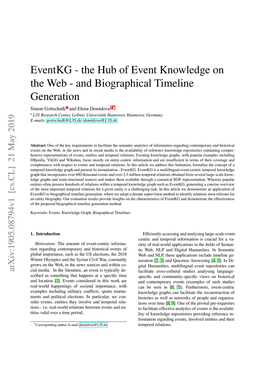 One of the key requirements to facilitate the semantic analytics of information regarding contemporary and historical events on the Web, in the news and in social media is the availability of reference knowledge repositories containing comprehensive representations of events, entities and temporal relations. Existing knowledge graphs, with popular examples including DBpedia, YAGO and Wikidata, focus mostly on entity-centric information and are insufficient in terms of their coverage and completeness with respect to events and temporal relations. In this article we address this limitation, formalise the concept of a temporal knowledge graph and present its instantiation - EventKG. EventKG is a multilingual event-centric temporal knowledge graph that incorporates over 690 thousand events and over 2.3 million temporal relations obtained from several large-scale knowledge graphs and semi-structured sources and makes them available through a canonical RDF representation. Whereas popular entities often possess hundreds of relations within a temporal knowledge graph such as EventKG, generating a concise overview of the most important temporal relations for a given entity is a challenging task. In this article we demonstrate an application of EventKG to biographical timeline generation, where we adopt a distant supervision method to identify relations most relevant for an entity biography. Our evaluation results provide insights on the characteristics of EventKG and demonstrate the effectiveness of the proposed biographical timeline generation method.