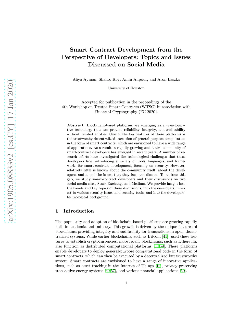 Blockchain-based platforms are emerging as a transformative technology that can provide reliability, integrity, and auditability without trusted entities. One of the key features of these platforms is the trustworthy decentralized execution of general-purpose computation in the form of smart contracts, which are envisioned to have a wide range of applications. As a result, a rapidly growing and active community of smart-contract developers has emerged in recent years. A number of research efforts have investigated the technological challenges that these developers face, introducing a variety of tools, languages, and frameworks for smart-contract development, focusing on security. However, relatively little is known about the community itself, about the developers, and about the issues that they face and discuss. To address this gap, we study smart-contract developers and their discussions on two social media sites, Stack Exchange and Medium. We provide insight into the trends and key topics of these discussions, into the developers' interest in various security issues and security tools, and into the developers' technological background.