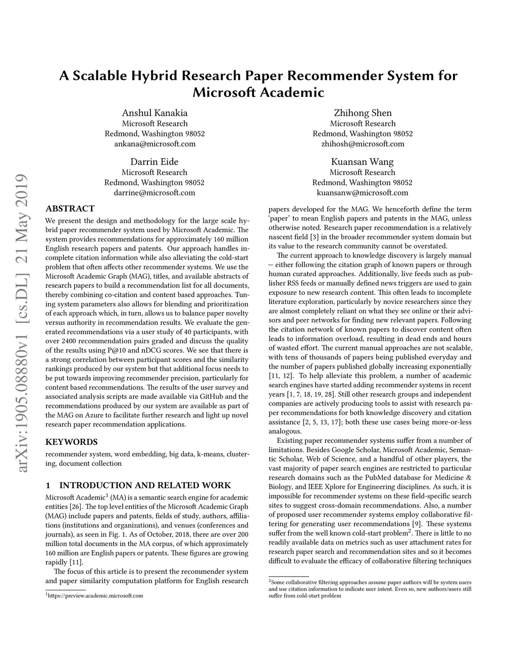 A Scalable Hybrid Research Paper Recommender System for Microsoft