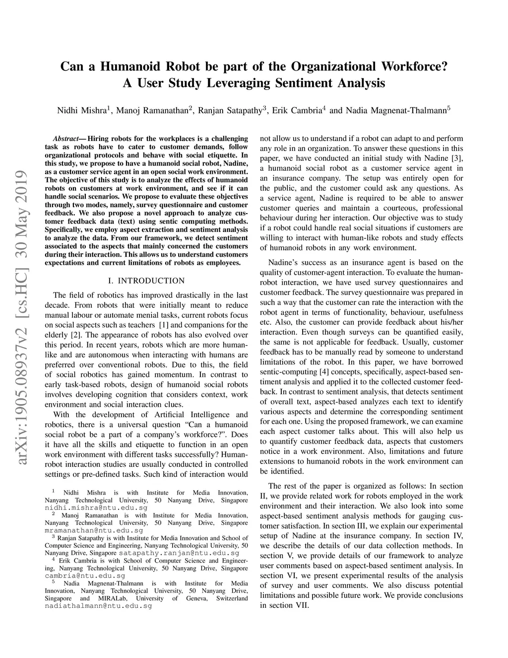 Hiring robots for the workplaces is a challenging task as robots have to cater to customer demands, follow organizational protocols and behave with social etiquette. In this study, we propose to have a humanoid social robot, Nadine, as a customer service agent in an open social work environment. The objective of this study is to analyze the effects of humanoid robots on customers at work environment, and see if it can handle social scenarios. We propose to evaluate these objectives through two modes, namely, survey questionnaire and customer feedback. We also propose a novel approach to analyze customer feedback data (text) using sentic computing methods. Specifically, we employ aspect extraction and sentiment analysis to analyze the data. From our framework, we detect sentiment associated to the aspects that mainly concerned the customers during their interaction. This allows us to understand customers expectations and current limitations of robots as employees.