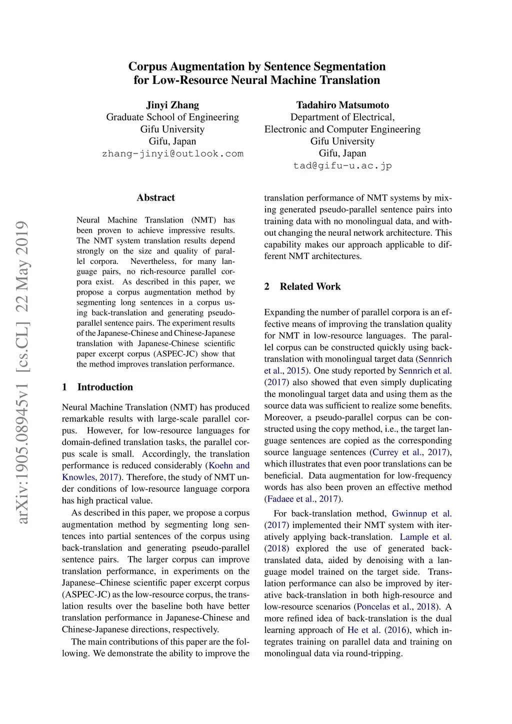 Neural Machine Translation (NMT) has been proven to achieve impressive results. The NMT system translation results depend strongly on the size and quality of parallel corpora. Nevertheless, for many language pairs, no rich-resource parallel corpora exist. As described in this paper, we propose a corpus augmentation method by segmenting long sentences in a corpus using back-translation and generating pseudo-parallel sentence pairs. The experiment results of the Japanese-Chinese and Chinese-Japanese translation with Japanese-Chinese scientific paper excerpt corpus (ASPEC-JC) show that the method improves translation performance.