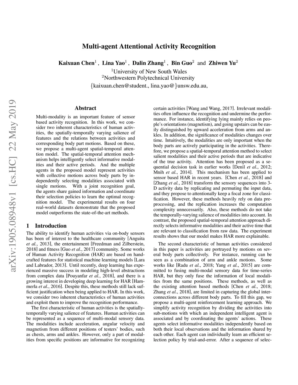 Multi-modality is an important feature of sensor based activity recognition. In this work, we consider two inherent characteristics of human activities, the spatially-temporally varying salience of features and the relations between activities and corresponding body part motions. Based on these, we propose a multi-agent spatial-temporal attention model. The spatial-temporal attention mechanism helps intelligently select informative modalities and their active periods. And the multiple agents in the proposed model represent activities with collective motions across body parts by independently selecting modalities associated with single motions. With a joint recognition goal, the agents share gained information and coordinate their selection policies to learn the optimal recognition model. The experimental results on four real-world datasets demonstrate that the proposed model outperforms the state-of-the-art methods.