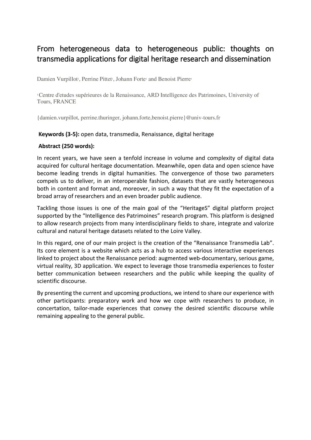 In recent years, we have seen a tenfold increase in volume and complexity of digital data acquired for cultural heritage documentation. Meanwhile, open data and open science have become leading trends in digital humanities. The convergence of those two parameters compels us to deliver, in an interoperable fashion, datasets that are vastly heterogeneous both in content and format and, moreover, in such a way that they fit the expectation of a broad array of researchers and an even broader public audience. Tackling those issues is one of the main goal of the "HeritageS" digital platform project supported by the "Intelligence des Patrimoines" research program. This platform is designed to allow research projects from many interdisciplinary fields to share, integrate and valorize cultural and natural heritage datasets related to the Loire Valley. In this regard, one of our main project is the creation of the "Renaissance Transmedia Lab". Its core element is a website which acts as a hub to access various interactive experiences linked to project about the Renaissance period: augmented web-documentary, serious game, virtual reality, 3D application. We expect to leverage those transmedia experiences to foster better communication between researchers and the public while keeping the quality of scientific discourse. By presenting the current and upcoming productions, we intend to share our experience with other participants: preparatory work and how we cope with researchers to produce, in concertation, tailor-made experiences that convey the desired scientific discourse while remaining appealing to the general public.