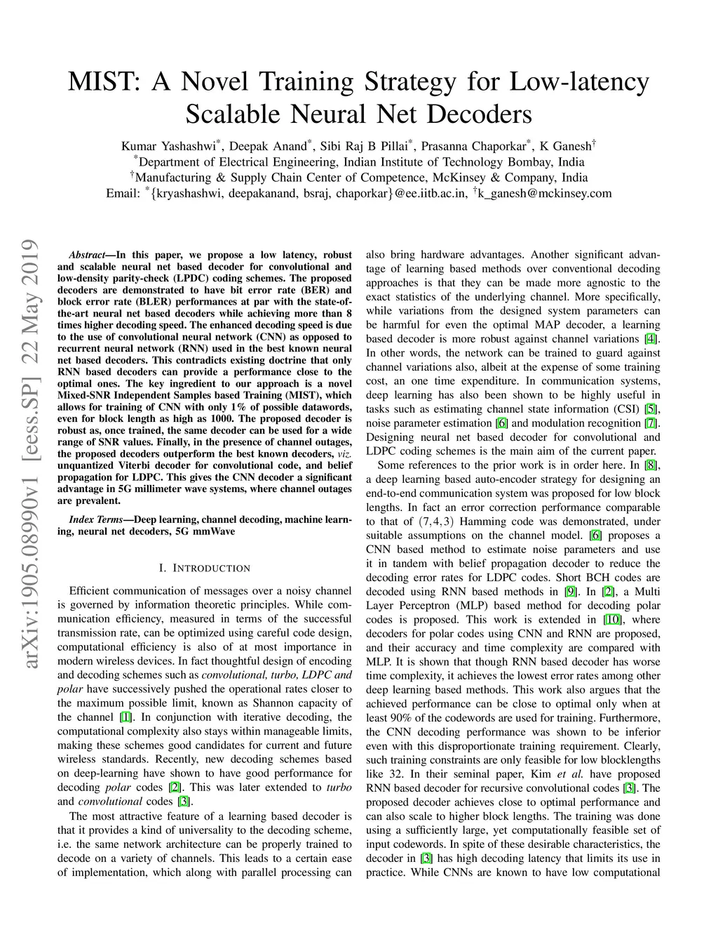 In this paper, we propose a low latency, robust and scalable neural net based decoder for convolutional and low-density parity-check (LPDC) coding schemes. The proposed decoders are demonstrated to have bit error rate (BER) and block error rate (BLER) performances at par with the state-of-the-art neural net based decoders while achieving more than 8 times higher decoding speed. The enhanced decoding speed is due to the use of convolutional neural network (CNN) as opposed to recurrent neural network (RNN) used in the best known neural net based decoders. This contradicts existing doctrine that only RNN based decoders can provide a performance close to the optimal ones. The key ingredient to our approach is a novel Mixed-SNR Independent Samples based Training (MIST), which allows for training of CNN with only 1\% of possible datawords, even for block length as high as 1000. The proposed decoder is robust as, once trained, the same decoder can be used for a wide range of SNR values. Finally, in the presence of channel outages, the proposed decoders outperform the best known decoders, {\it viz.} unquantized Viterbi decoder for convolutional code, and belief propagation for LDPC. This gives the CNN decoder a significant advantage in 5G millimeter wave systems, where channel outages are prevalent.