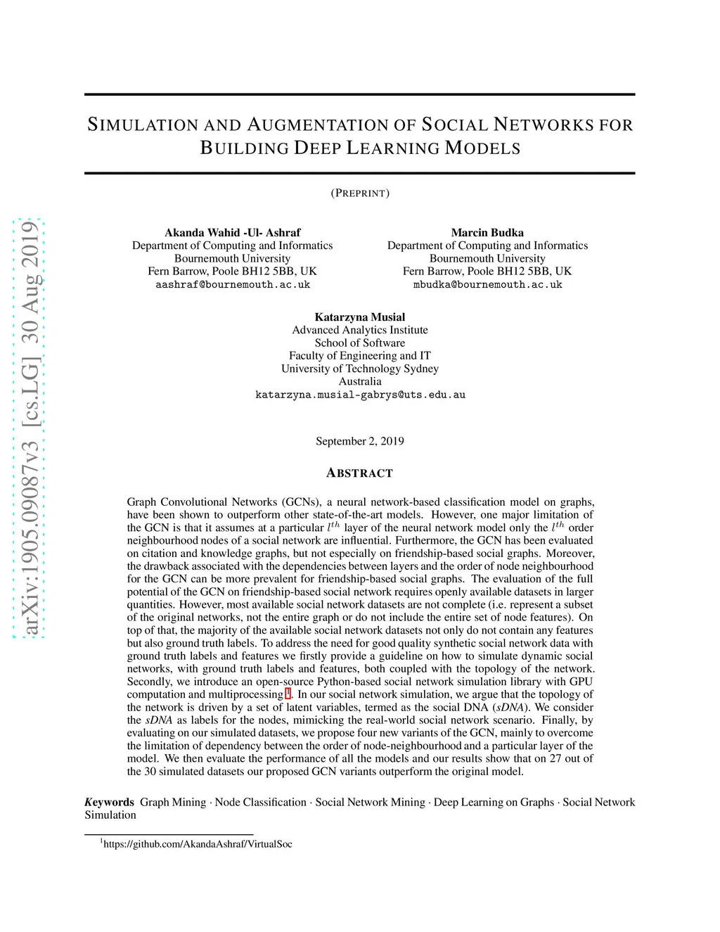 A limitation of the Graph Convolutional Networks (GCNs) is that it assumes at a particular layer of the neural network model only the order neighbourhood nodes of a social network are influential. Furthermore, the GCN has been evaluated on citation and knowledge graphs, but not extensively on friendship-based social graphs. The drawback associated with the dependencies between layers and the order of node neighbourhood for the GCN can be more prevalent for friendship-based graphs. The evaluation of the full potential of the GCN on friendship-based social network requires openly available datasets in larger quantities. However, most available social network datasets are not complete. Also, the majority of the available social network datasets do not contain both the features and ground truth labels. In this work, firstly, we provide a guideline on simulating dynamic social networks, with ground truth labels and features, both coupled with the topology. Secondly, we introduce an open-source Python-based simulation library. We argue that the topology of the network is driven by a set of latent variables, termed as the social DNA (sDNA). We consider the sDNA as labels for the nodes. Finally, by evaluating on our simulated datasets, we propose four new variants of the GCN, mainly to overcome the limitation of dependency between the order of node-neighbourhood and a particular layer of the model. We then evaluate the performance of all the models and our results show that on 27 out of the 30 simulated datasets our proposed GCN variants outperform the original model.