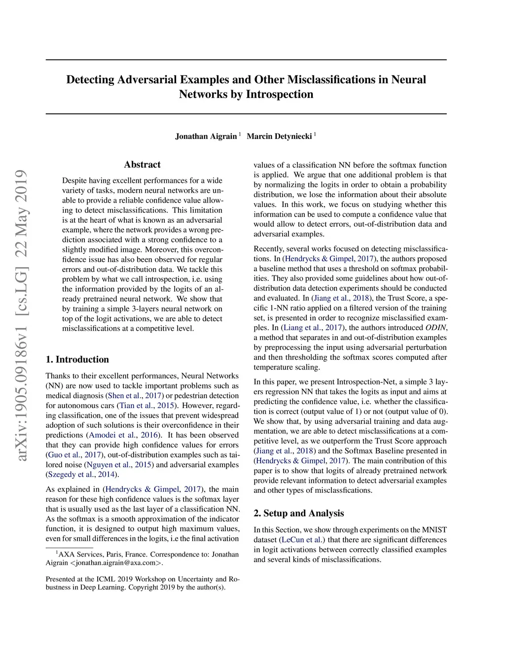 Despite having excellent performances for a wide variety of tasks, modern neural networks are unable to provide a reliable confidence value allowing to detect misclassifications. This limitation is at the heart of what is known as an adversarial example, where the network provides a wrong prediction associated with a strong confidence to a slightly modified image. Moreover, this overconfidence issue has also been observed for regular errors and out-of-distribution data. We tackle this problem by what we call introspection, i.e. using the information provided by the logits of an already pretrained neural network. We show that by training a simple 3-layers neural network on top of the logit activations, we are able to detect misclassifications at a competitive level.