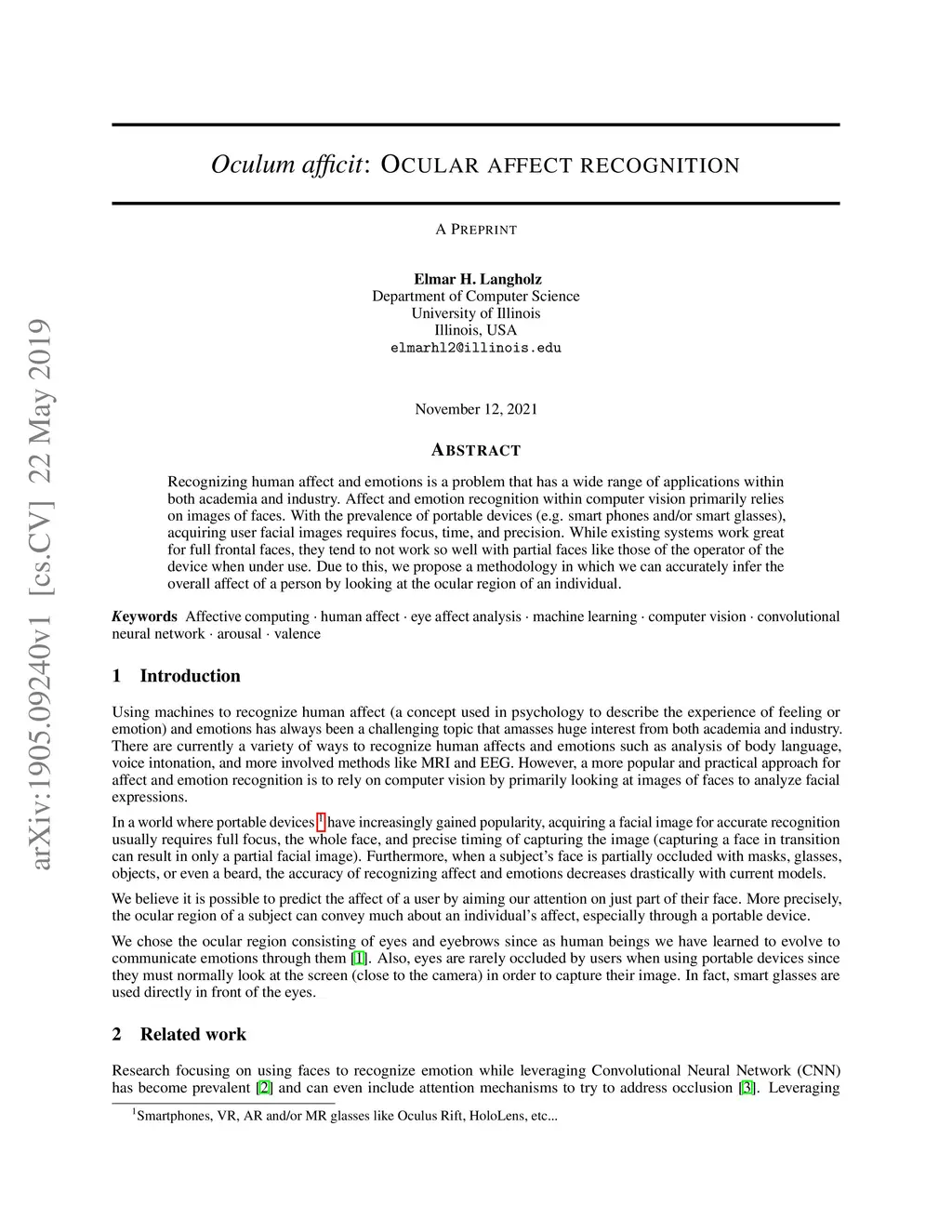 Recognizing human affect and emotions is a problem that has a wide range of applications within both academia and industry. Affect and emotion recognition within computer vision primarily relies on images of faces. With the prevalence of portable devices (e.g. smart phones and/or smart glasses),acquiring user facial images requires focus, time, and precision. While existing systems work great for full frontal faces, they tend to not work so well with partial faces like those of the operator of the device when under use. Due to this, we propose a methodology in which we can accurately infer the overall affect of a person by looking at the ocular region of an individual.