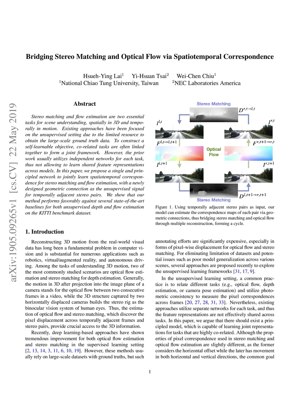 Stereo matching and flow estimation are two essential tasks for scene understanding, spatially in 3D and temporally in motion. Existing approaches have been focused on the unsupervised setting due to the limited resource to obtain the large-scale ground truth data. To construct a self-learnable objective, co-related tasks are often linked together to form a joint framework. However, the prior work usually utilizes independent networks for each task, thus not allowing to learn shared feature representations across models. In this paper, we propose a single and principled network to jointly learn spatiotemporal correspondence for stereo matching and flow estimation, with a newly designed geometric connection as the unsupervised signal for temporally adjacent stereo pairs. We show that our method performs favorably against several state-of-the-art baselines for both unsupervised depth and flow estimation on the KITTI benchmark dataset.