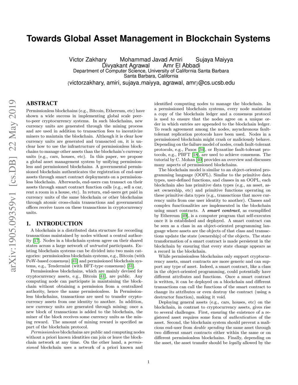 Permissionless blockchains (e.g., Bitcoin, Ethereum, etc) have shown a wide success in implementing global scale peer-to-peer cryptocurrency systems. In such blockchains, new currency units are generated through the mining process and are used in addition to transaction fees to incentivize miners to maintain the blockchain. Although it is clear how currency units are generated and transacted on, it is unclear how to use the infrastructure of permissionless blockchains to manage other assets than the blockchain's currency units (e.g., cars, houses, etc). In this paper, we propose a global asset management system by unifying permissioned and permissionless blockchains. A governmental permissioned blockchain authenticates the registration of end-user assets through smart contract deployments on a permissionless blockchain. Afterwards, end-users can transact on their assets through smart contract function calls (e.g., sell a car, rent a room in a house, etc). In return, end-users get paid in currency units of the same blockchain or other blockchains through atomic cross-chain transactions and governmental offices receive taxes on these transactions in cryptocurrency units.