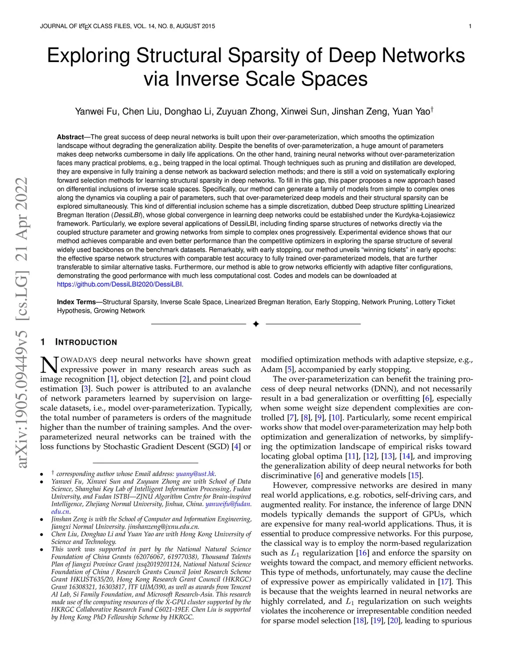 The great success of deep neural networks is built upon their over-parameterization, which smooths the optimization landscape without degrading the generalization ability. Despite the benefits of over-parameterization, a huge amount of parameters makes deep networks cumbersome in daily life applications. Though techniques such as pruning and distillation are developed, they are expensive in fully training a dense network as backward selection methods, and there is still a void on systematically exploring forward selection methods for learning structural sparsity in deep networks. To fill in this gap, this paper proposes a new approach based on differential inclusions of inverse scale spaces, which generate a family of models from simple to complex ones along the dynamics via coupling a pair of parameters, such that over-parameterized deep models and their structural sparsity can be explored simultaneously. This kind of differential inclusion scheme has a simple discretization, dubbed Deep structure splitting Linearized Bregman Iteration (DessiLBI), whose global convergence in learning deep networks could be established under the Kurdyka-Lojasiewicz framework. Experimental evidence shows that our method achieves comparable and even better performance than the competitive optimizers in exploring the sparse structure of several widely used backbones on the benchmark datasets. Remarkably, with early stopping, our method unveils `winning tickets' in early epochs: the effective sparse network structures with comparable test accuracy to fully trained over-parameterized models, that are further transferable to similar alternative tasks. Furthermore, our method is able to grow networks efficiently with adaptive filter configurations, demonstrating a good performance with much less computational cost. Codes and models can be downloaded at {https://github.com/DessiLBI2020/DessiLBI}.