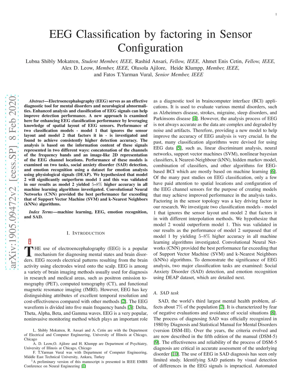 Electroencephalography (EEG) serves as an effective diagnostic tool for mental disorders and neurological abnormalities. Enhanced analysis and classification of EEG signals can help improve detection performance. This work presents a new approach that seeks to exploit the knowledge of EEG sensor spatial configuration to achieve higher detection accuracy. Two classification models, one which ignores the configuration (model 1) and one that exploits it with different interpolation methods (model 2), are studied. The analysis is based on the information content of these signals represented in two different ways: concatenation of the channels of the frequency bands and an image-like 2D representation of the EEG channel locations. Performance of these models is examined on two tasks, social anxiety disorder (SAD) detection, and emotion recognition using DEAP dataset. Validity of our hypothesis that model 2 will significantly outperform model 1 is borne out in the results, with accuracy -- higher for model 2 for each machine learning algorithm we investigated. Convolutional Neural Networks (CNN) were found to provide much better performance than SVM and kNNs.