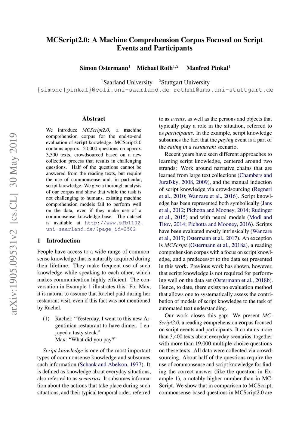 We introduce MCScript2.0, a machine comprehension corpus for the end-to-end evaluation of script knowledge. MCScript2.0 contains approx. 20,000 questions on approx. 3,500 texts, crowdsourced based on a new collection process that results in challenging questions. Half of the questions cannot be answered from the reading texts, but require the use of commonsense and, in particular, script knowledge. We give a thorough analysis of our corpus and show that while the task is not challenging to humans, existing machine comprehension models fail to perform well on the data, even if they make use of a commonsense knowledge base. The dataset is available at http://www.sfb1102.uni-saarland.de/?page_id=2582
