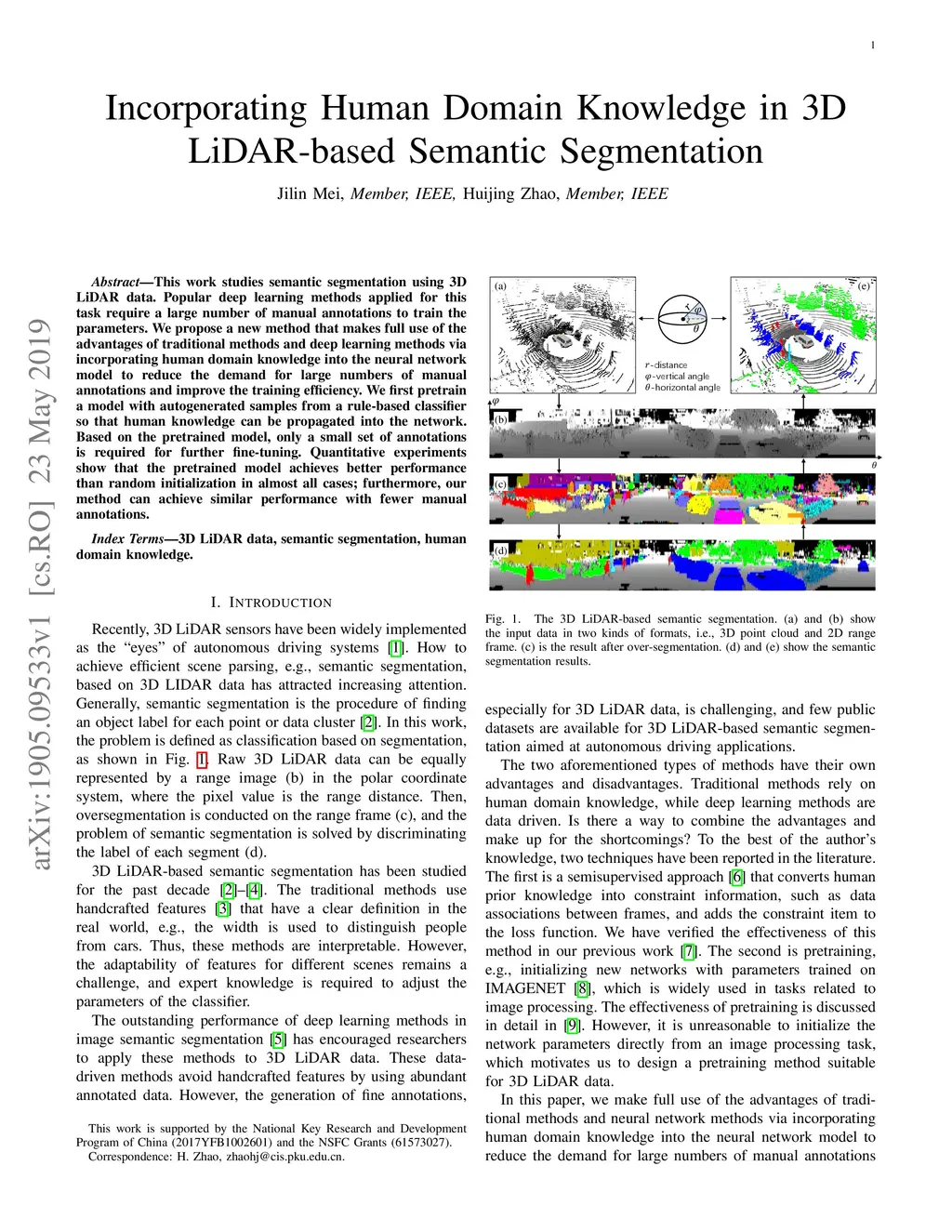 This work studies semantic segmentation using 3D LiDAR data. Popular deep learning methods applied for this task require a large number of manual annotations to train the parameters. We propose a new method that makes full use of the advantages of traditional methods and deep learning methods via incorporating human domain knowledge into the neural network model to reduce the demand for large numbers of manual annotations and improve the training efficiency. We first pretrain a model with autogenerated samples from a rule-based classifier so that human knowledge can be propagated into the network. Based on the pretrained model, only a small set of annotations is required for further fine-tuning. Quantitative experiments show that the pretrained model achieves better performance than random initialization in almost all cases; furthermore, our method can achieve similar performance with fewer manual annotations.