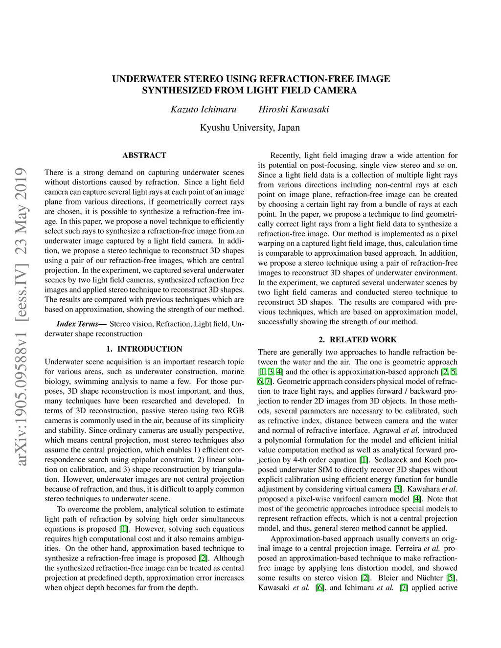 Underwater Stereo using Refraction-free Image Synthesized from Light