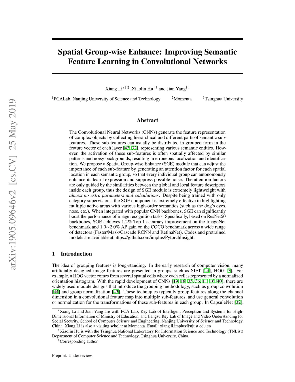 Spatial Group-wise Enhance: Improving Semantic Feature Learning in