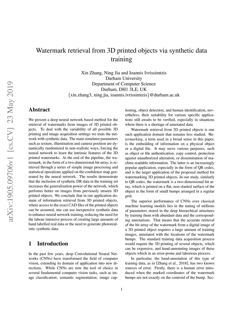 We present a deep neural network based method for the retrieval of watermarks from images of 3D printed objects. To deal with the variability of all possible 3D printing and image acquisition settings we train the network with synthetic data. The main simulator parameters such as texture, illumination and camera position are dynamically randomized in non-realistic ways, forcing the neural network to learn the intrinsic features of the 3D printed watermarks. At the end of the pipeline, the watermark, in the form of a two-dimensional bit array, is retrieved through a series of simple image processing and statistical operations applied on the confidence map generated by the neural network. The results demonstrate that the inclusion of synthetic DR data in the training set increases the generalization power of the network, which performs better on images from previously unseen 3D printed objects. We conclude that in our application domain of information retrieval from 3D printed objects, where access to the exact CAD files of the printed objects can be assumed, one can use inexpensive synthetic data to enhance neural network training, reducing the need for the labour intensive process of creating large amounts of hand labelled real data or the need to generate photorealistic synthetic data.