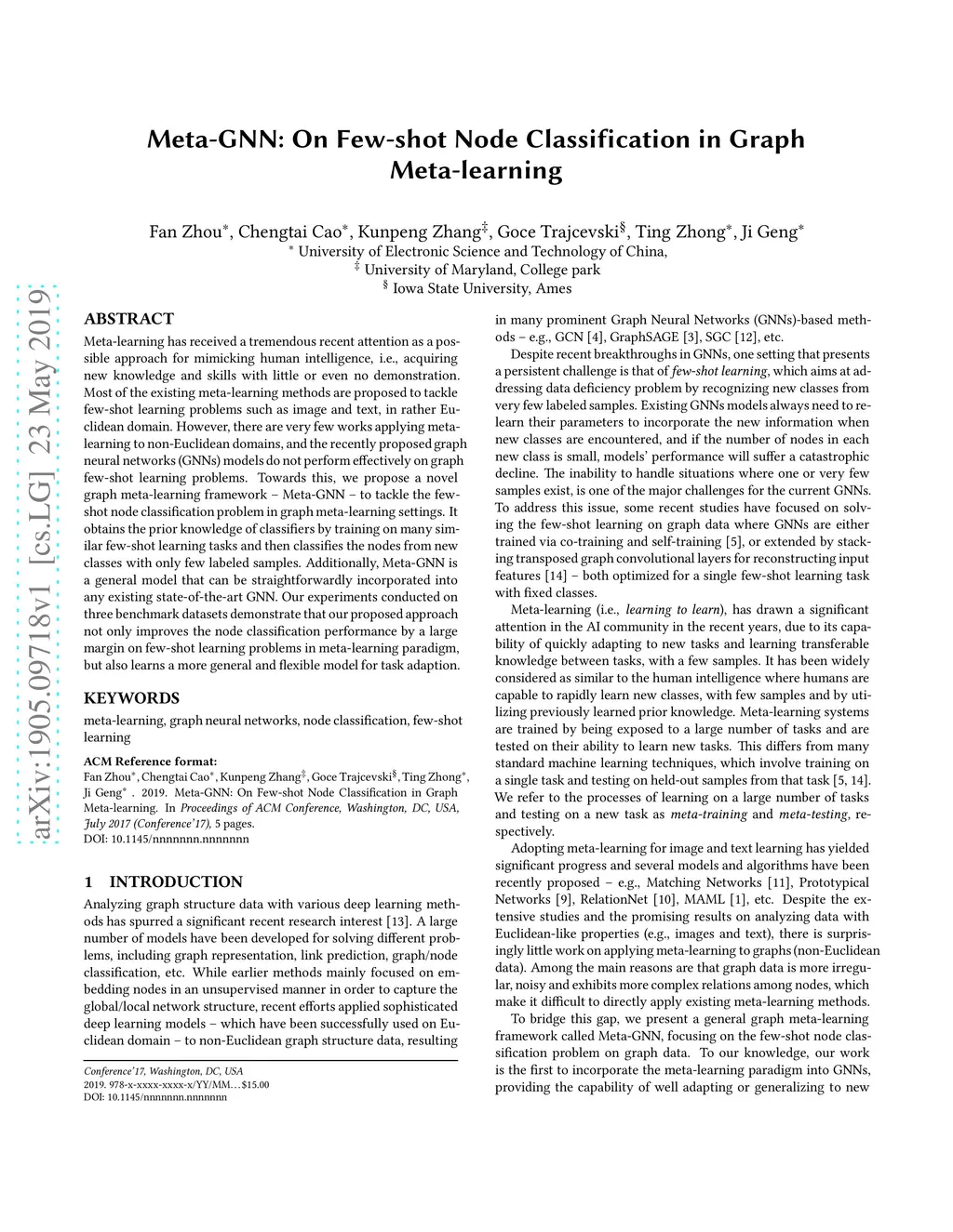 Meta-learning has received a tremendous recent attention as a possible approach for mimicking human intelligence, i.e., acquiring new knowledge and skills with little or even no demonstration. Most of the existing meta-learning methods are proposed to tackle few-shot learning problems such as image and text, in rather Euclidean domain. However, there are very few works applying meta-learning to non-Euclidean domains, and the recently proposed graph neural networks (GNNs) models do not perform effectively on graph few-shot learning problems. Towards this, we propose a novel graph meta-learning framework -- Meta-GNN -- to tackle the few-shot node classification problem in graph meta-learning settings. It obtains the prior knowledge of classifiers by training on many similar few-shot learning tasks and then classifies the nodes from new classes with only few labeled samples. Additionally, Meta-GNN is a general model that can be straightforwardly incorporated into any existing state-of-the-art GNN. Our experiments conducted on three benchmark datasets demonstrate that our proposed approach not only improves the node classification performance by a large margin on few-shot learning problems in meta-learning paradigm, but also learns a more general and flexible model for task adaption.