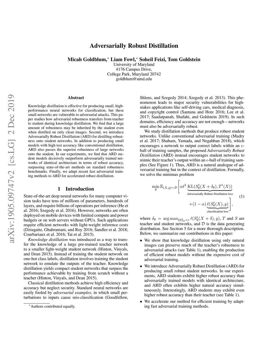 Knowledge distillation is effective for producing small, high-performance neural networks for classification, but these small networks are vulnerable to adversarial attacks. This paper studies how adversarial robustness transfers from teacher to student during knowledge distillation. We find that a large amount of robustness may be inherited by the student even when distilled on only clean images. Second, we introduce Adversarially Robust Distillation (ARD) for distilling robustness onto student networks. In addition to producing small models with high test accuracy like conventional distillation, ARD also passes the superior robustness of large networks onto the student. In our experiments, we find that ARD student models decisively outperform adversarially trained networks of identical architecture in terms of robust accuracy, surpassing state-of-the-art methods on standard robustness benchmarks. Finally, we adapt recent fast adversarial training methods to ARD for accelerated robust distillation.