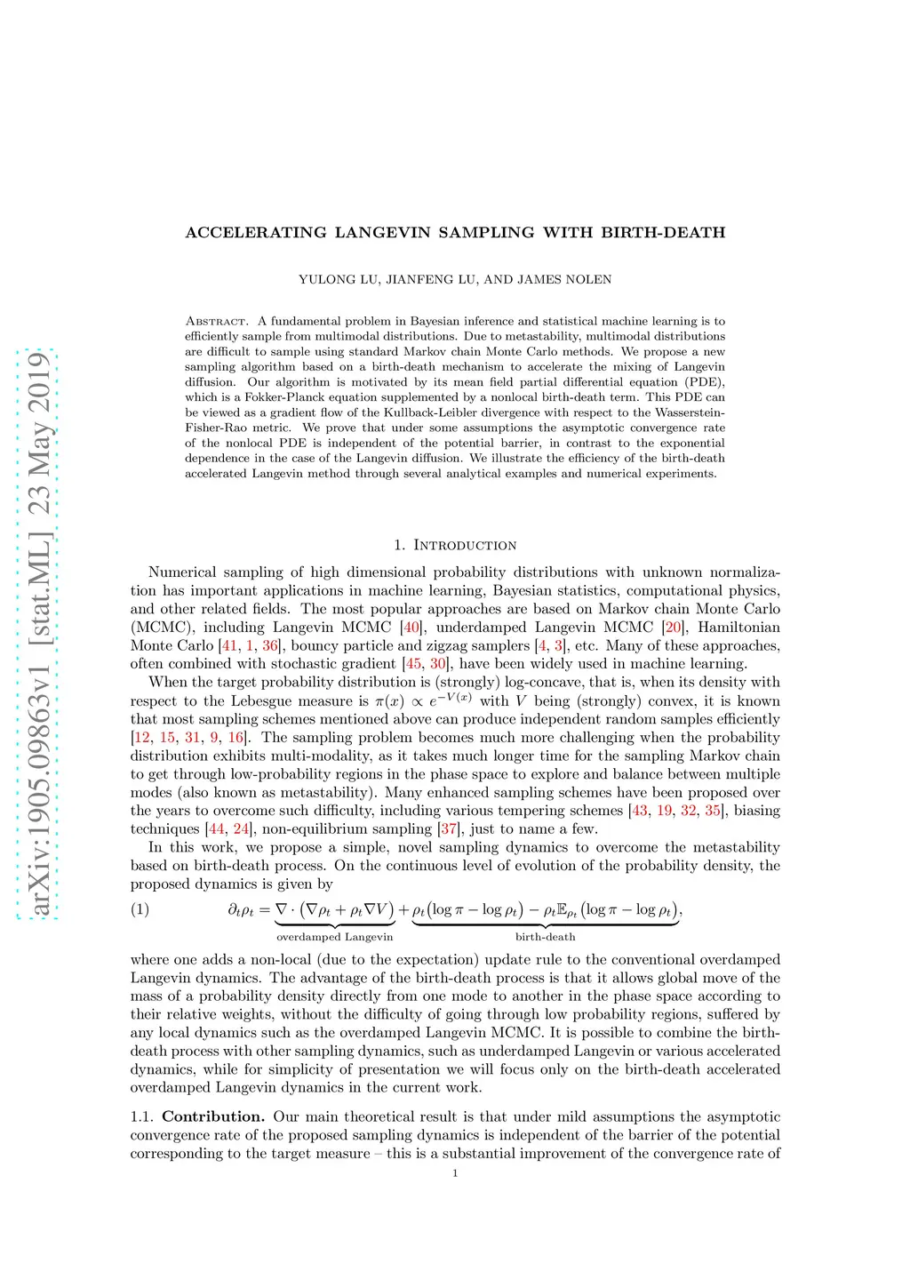 A fundamental problem in Bayesian inference and statistical machine learning is to efficiently sample from multimodal distributions. Due to metastability, multimodal distributions are difficult to sample using standard Markov chain Monte Carlo methods. We propose a new sampling algorithm based on a birth-death mechanism to accelerate the mixing of Langevin diffusion. Our algorithm is motivated by its mean field partial differential equation (PDE), which is a Fokker-Planck equation supplemented by a nonlocal birth-death term. This PDE can be viewed as a gradient flow of the Kullback-Leibler divergence with respect to the Wasserstein-Fisher-Rao metric. We prove that under some assumptions the asymptotic convergence rate of the nonlocal PDE is independent of the potential barrier, in contrast to the exponential dependence in the case of the Langevin diffusion. We illustrate the efficiency of the birth-death accelerated Langevin method through several analytical examples and numerical experiments.