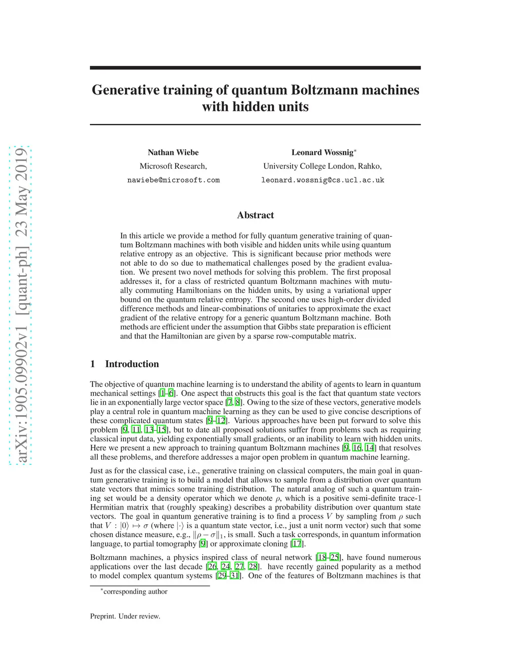 In this article we provide a method for fully quantum generative training of quantum Boltzmann machines with both visible and hidden units while using quantum relative entropy as an objective. This is significant because prior methods were not able to do so due to mathematical challenges posed by the gradient evaluation. We present two novel methods for solving this problem. The first proposal addresses it, for a class of restricted quantum Boltzmann machines with mutually commuting Hamiltonians on the hidden units, by using a variational upper bound on the quantum relative entropy. The second one uses high-order divided difference methods and linear-combinations of unitaries to approximate the exact gradient of the relative entropy for a generic quantum Boltzmann machine. Both methods are efficient under the assumption that Gibbs state preparation is efficient and that the Hamiltonian are given by a sparse row-computable matrix.