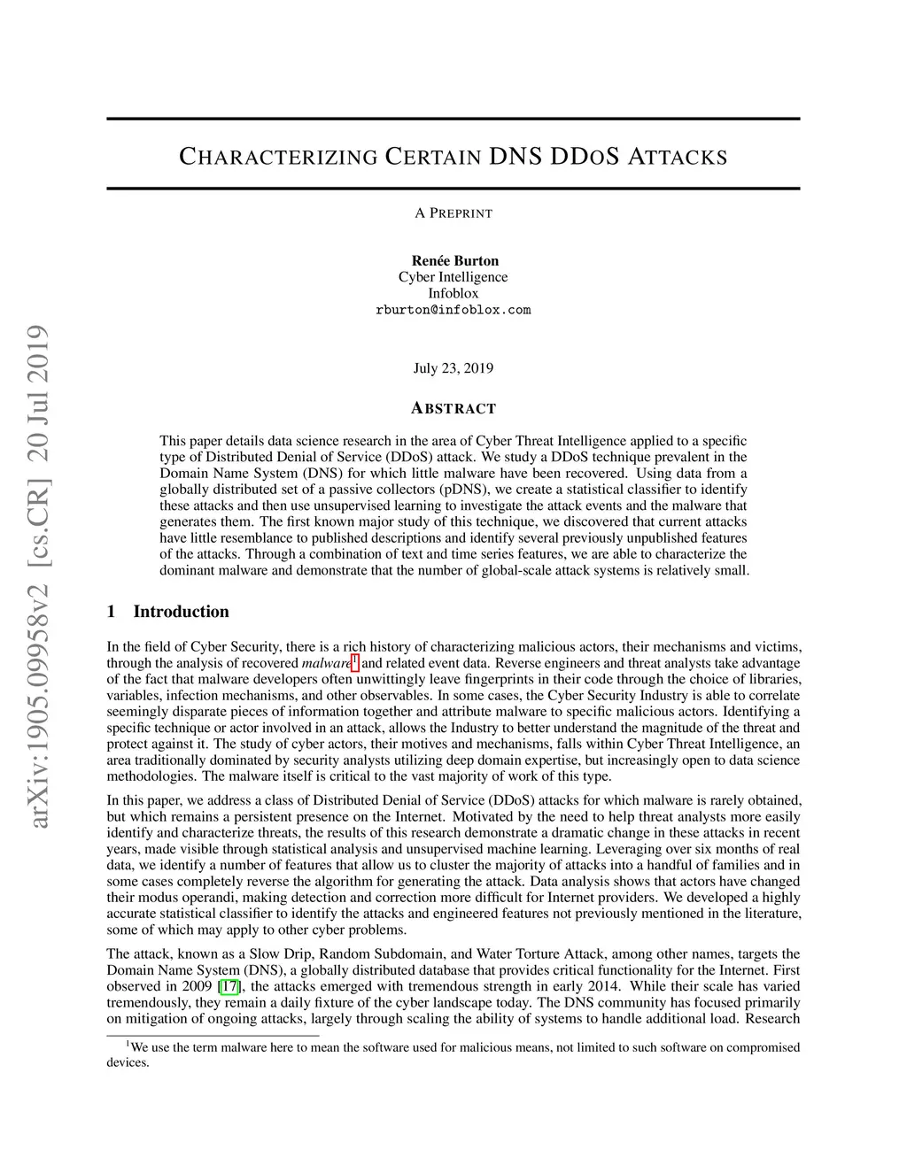 This paper details data science research in the area of Cyber Threat Intelligence applied to a specific type of Distributed Denial of Service (DDoS) attack. We study a DDoS technique prevalent in the Domain Name System (DNS) for which little malware have been recovered. Using data from a globally distributed set of a passive collectors (pDNS), we create a statistical classifier to identify these attacks and then use unsupervised learning to investigate the attack events and the malware that generates them. The first known major study of this technique, we discovered that current attacks have little resemblance to published descriptions and identify several previously unpublished features of the attacks. Through a combination of text and time series features, we are able to characterize the dominant malware and demonstrate that the number of global-scale attack systems is relatively small.