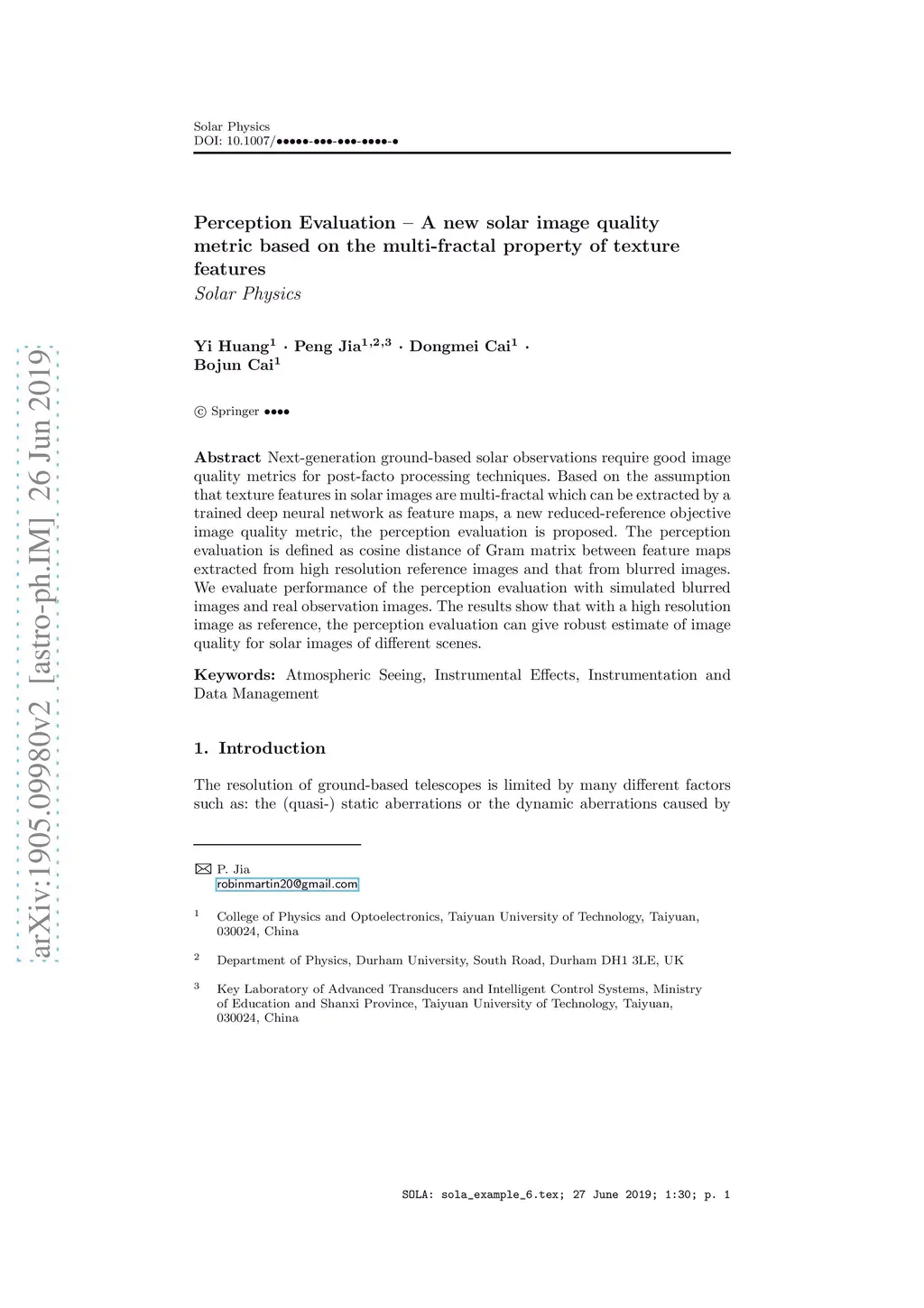 Next-generation ground-based solar observations require good image quality metrics for post-facto processing techniques. Based on the assumption that texture features in solar images are multi-fractal which can be extracted by a trained deep neural network as feature maps, a new reduced-reference objective image quality metric, the perception evaluation is proposed. The perception evaluation is defined as cosine distance of Gram matrix between feature maps extracted from high resolution reference image and that from blurred images. We evaluate performance of the perception evaluation with simulated and real observation images. The results show that with a high resolution image as reference, the perception evaluation can give robust estimate of image quality for solar images of different scenes.