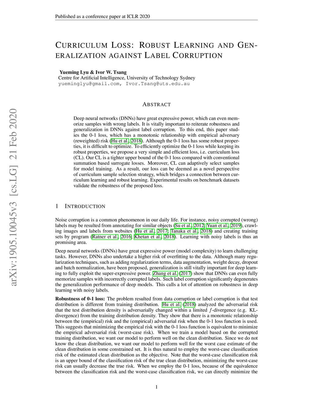Deep neural networks (DNNs) have great expressive power, which can even memorize samples with wrong labels. It is vitally important to reiterate robustness and generalization in DNNs against label corruption. To this end, this paper studies the 0-1 loss, which has a monotonic relationship with an empirical adversary (reweighted) risk~\citep{hu2016does}. Although the 0-1 loss has some robust properties, it is difficult to optimize. To efficiently optimize the 0-1 loss while keeping its robust properties, we propose a very simple and efficient loss, i.e. curriculum loss (CL). Our CL is a tighter upper bound of the 0-1 loss compared with conventional summation based surrogate losses. Moreover, CL can adaptively select samples for model training. As a result, our loss can be deemed as a novel perspective of curriculum sample selection strategy, which bridges a connection between curriculum learning and robust learning. Experimental results on benchmark datasets validate the robustness of the proposed loss.